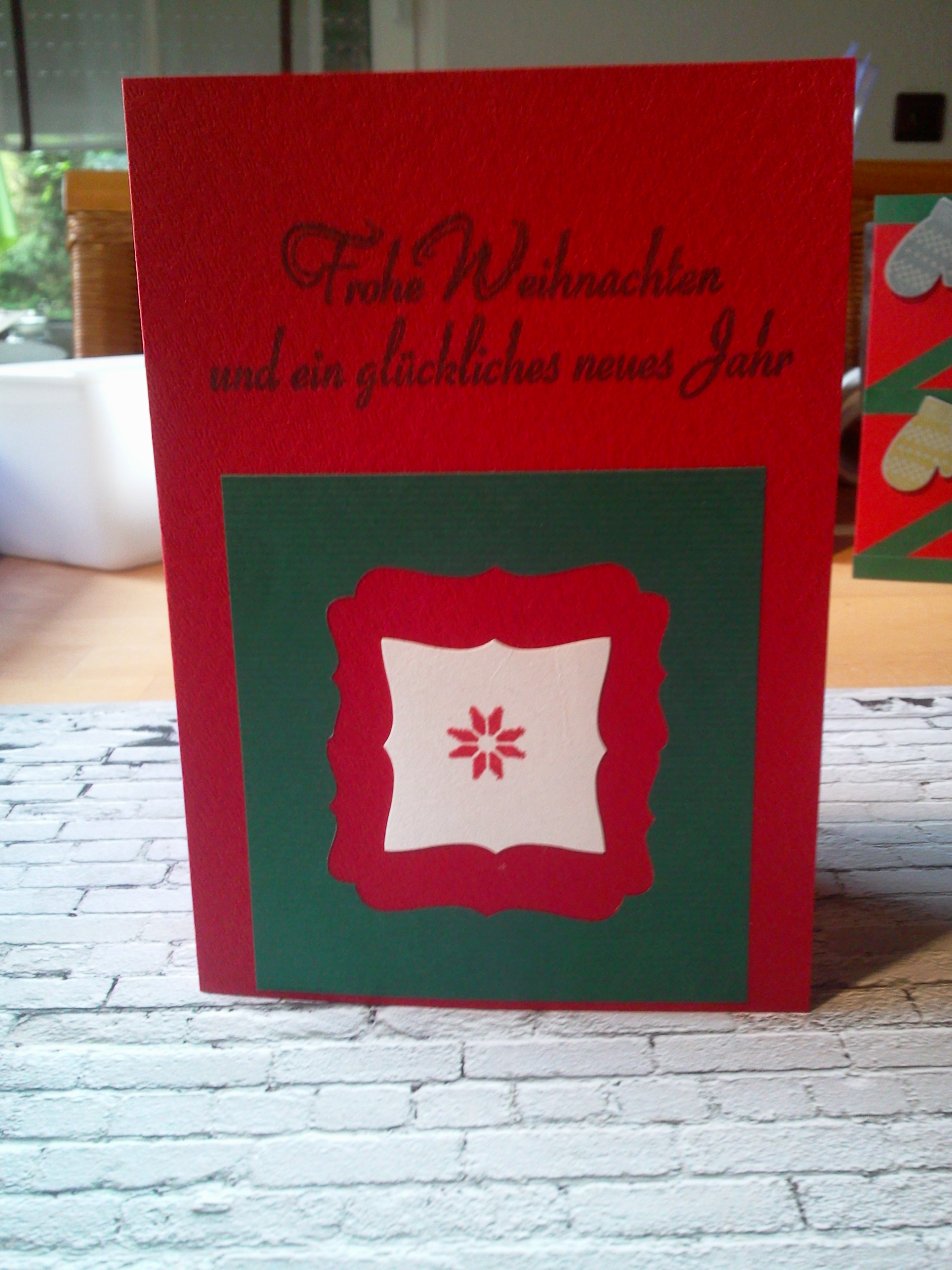 In Weihnachtsstern-Farben gestaltete Karte. Meine Weihnachtssterne aus der Adventszeit 2012 stehen immer noch auf meiner Fensterbank und werden immer größer. Momentan sind sie oben grün und unten noch ein bisschen rot. Mal sehen, ob bis Weihnachten oben wieder eine neue Schicht roter Blätter kommt. Ich bin gespannt.