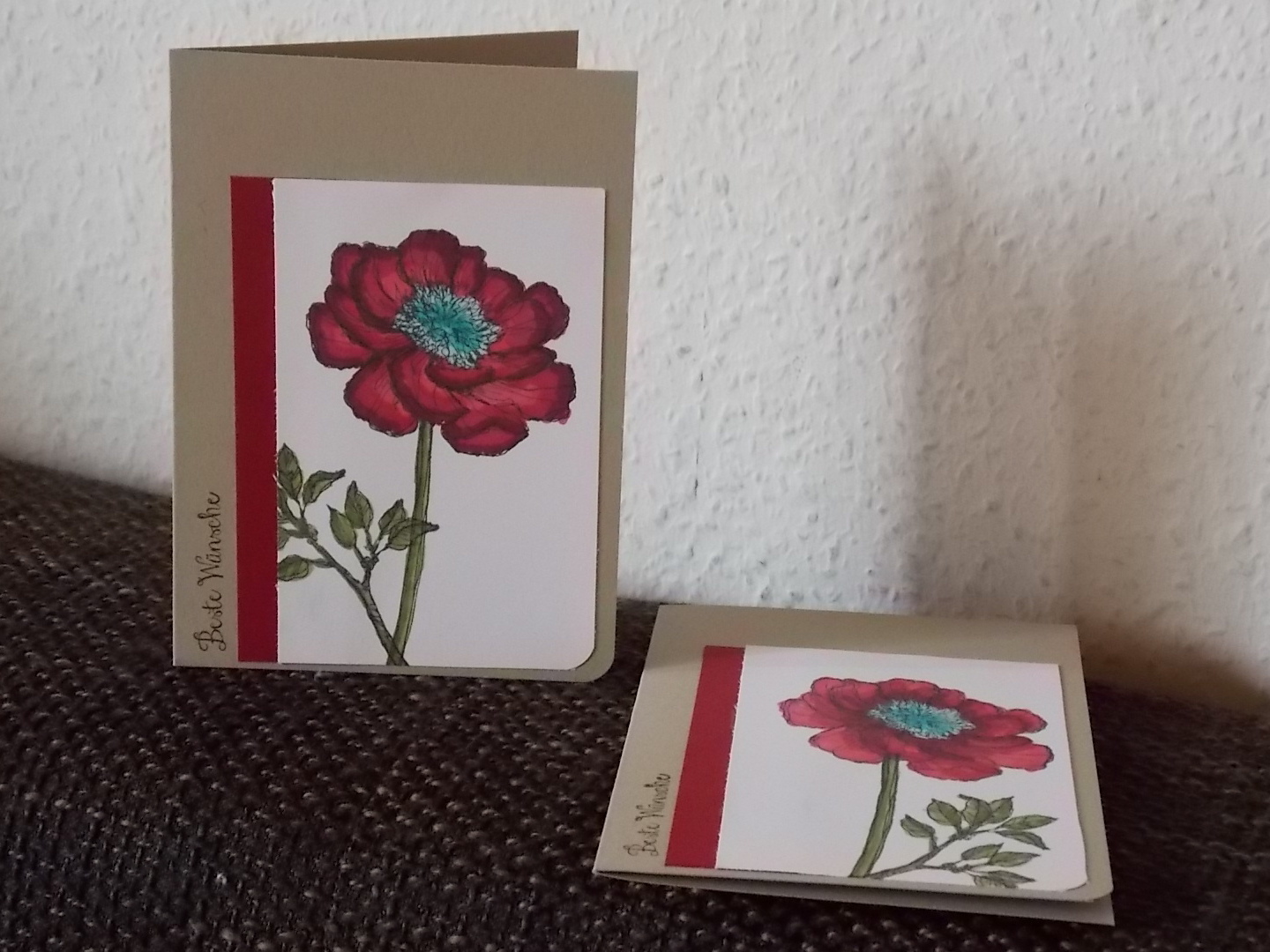 Für diese Karten habe ich ein neues Gastgeberinnen- Stempelset verwendet. Erst mit „Memento“ stempeln und dann mit den Blendabilities colorieren. Hier in den Farben: Chili, Olivgrün und Jade. Ich mag diese Stifte. Sie sind einfach ein Traum.