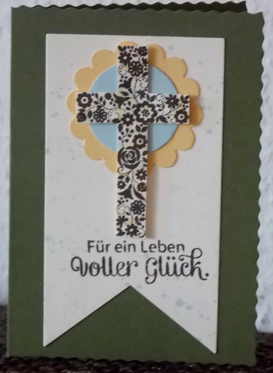 Wenn man genau hinsieht, kann man sehen, dass ich das Papier erst in blau und gelb angemalt und dann in braun das Kreuz gestempelt habe. So finden sich im Hintergrund die Farben Safrangelb und Türkis von der Symbolischen Sonne wieder. Je nach Spruch lässt sich aus diesem Sketch eine christliche Geburtstagskarte machen oder aber für Kommunion, Konfirmation und Taufe.