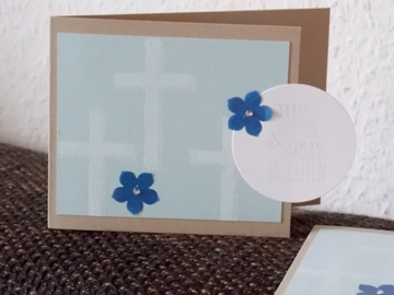 Als Kontrast habe ich kleine Blüten aus blauem Transparentpapier gestanzt und mit einem Steinchen versehen. Und fertig sind schlichte Karten. Der Sketch eignet sich auch sehr gut als Einladungskarte. Übrigens werde ich im Januar und Februar 2015 Bastelabende anbieten für die Herstellung von Einladungskarten zur Kommunion. Bei Interesse am besten rechtzeitig schon Farbwünsche äußern. Nach Weihnachten gibt es die Neuen Termine für 2015.