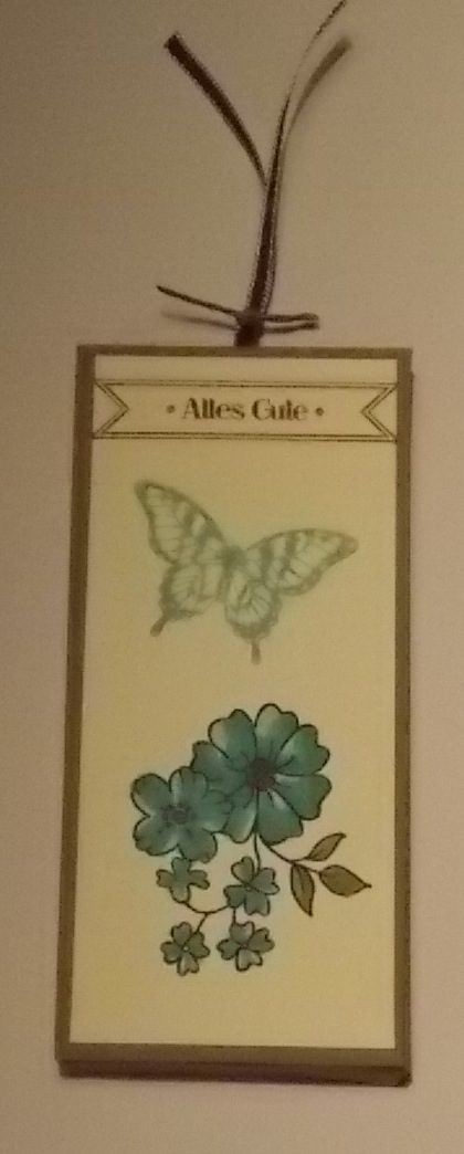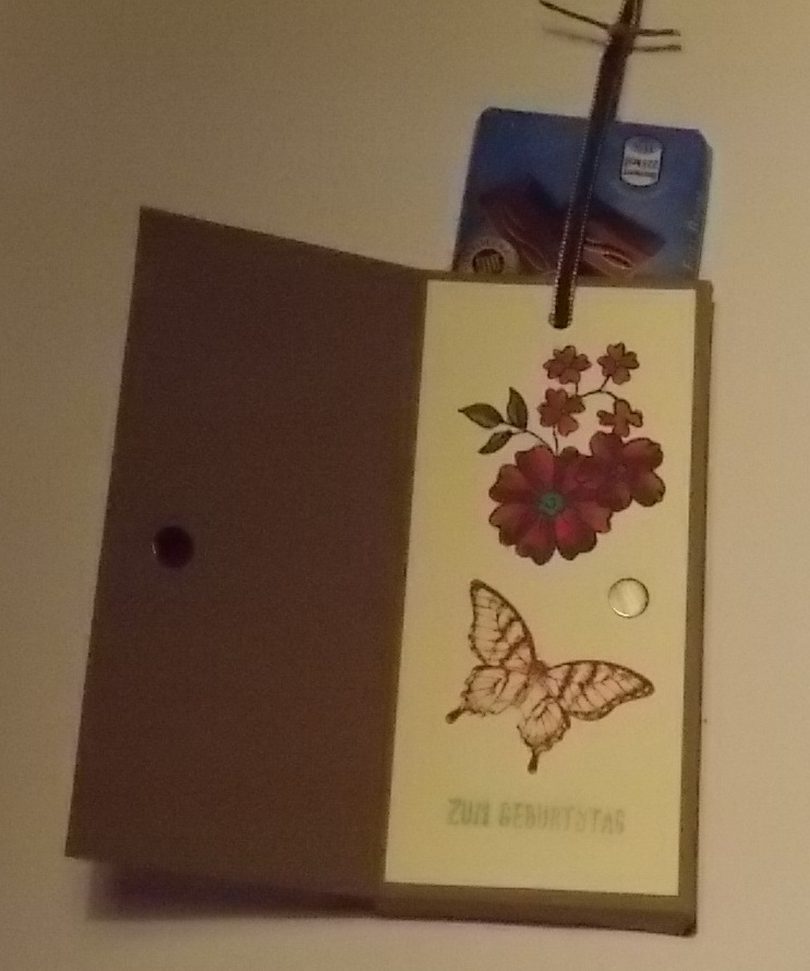 Diesmal habe ich die Schokoladenkarte mit den Blendabilities verziert. Auf dem Deckblatt habe ich die Blume in Jade und Olivgrün ausgemalt und passend dazu den Schmetterling in Jade gestempelt.