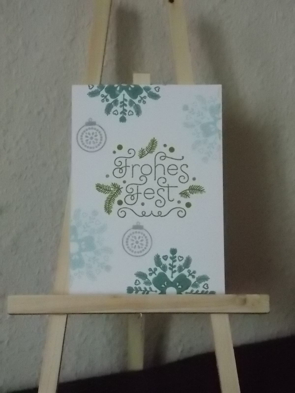 Ganz schnell und einfach ist diese Karte gemacht. Zentral ist in Olivgrün der Weihnachtsgruß und drum herum in Lagunenblau und Himmelblau Weihnachtliche Muster.