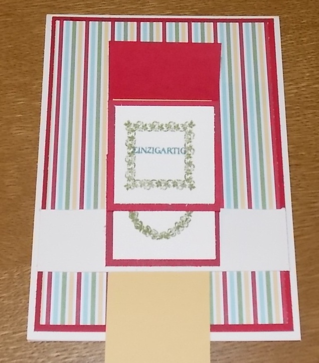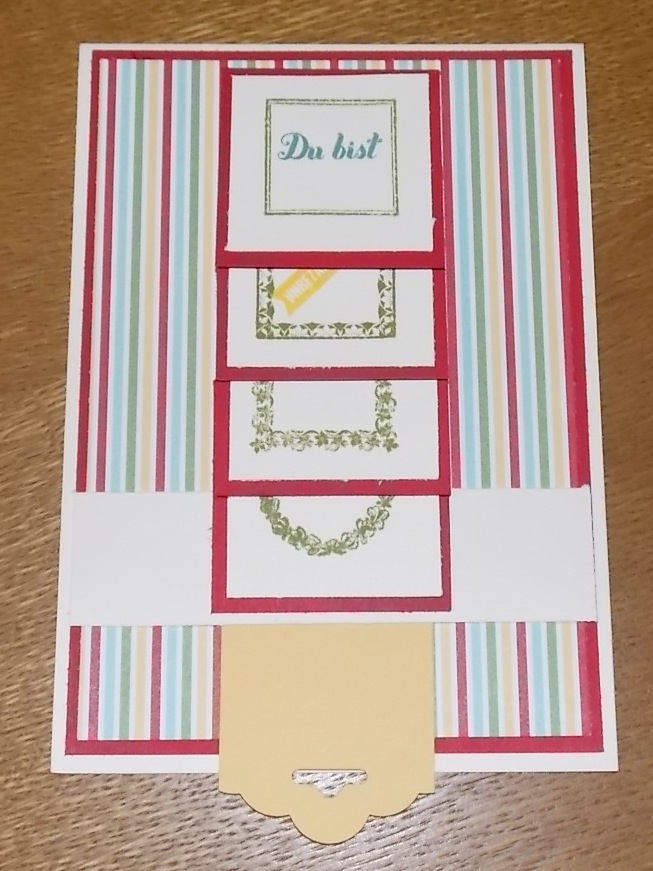 Nun aber zurück zu meiner heutigen Karte. Das Thema der Woche lautet immer noch altes Designpapier verbrauchen. Diese Streifen finde ich besonders schön und habe gleich wieder ein paar Bausätze zusammen gestellt. So kann ich ganz schnell mal wieder eine individuelle Wasserfallkarte gestalten.