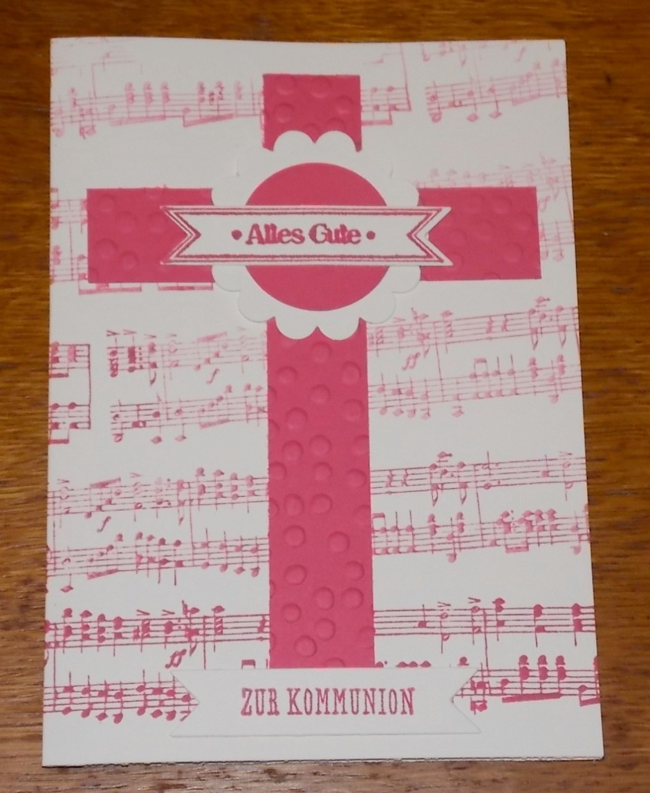 wie versprochen gibt es heute die 5. und letzte Variante meiner „Kreuz“ Karten. Farblich Ton in Ton habe ich mich hier für Rhabarberrot entschieden. Eine absolute Mädchen Farbe.