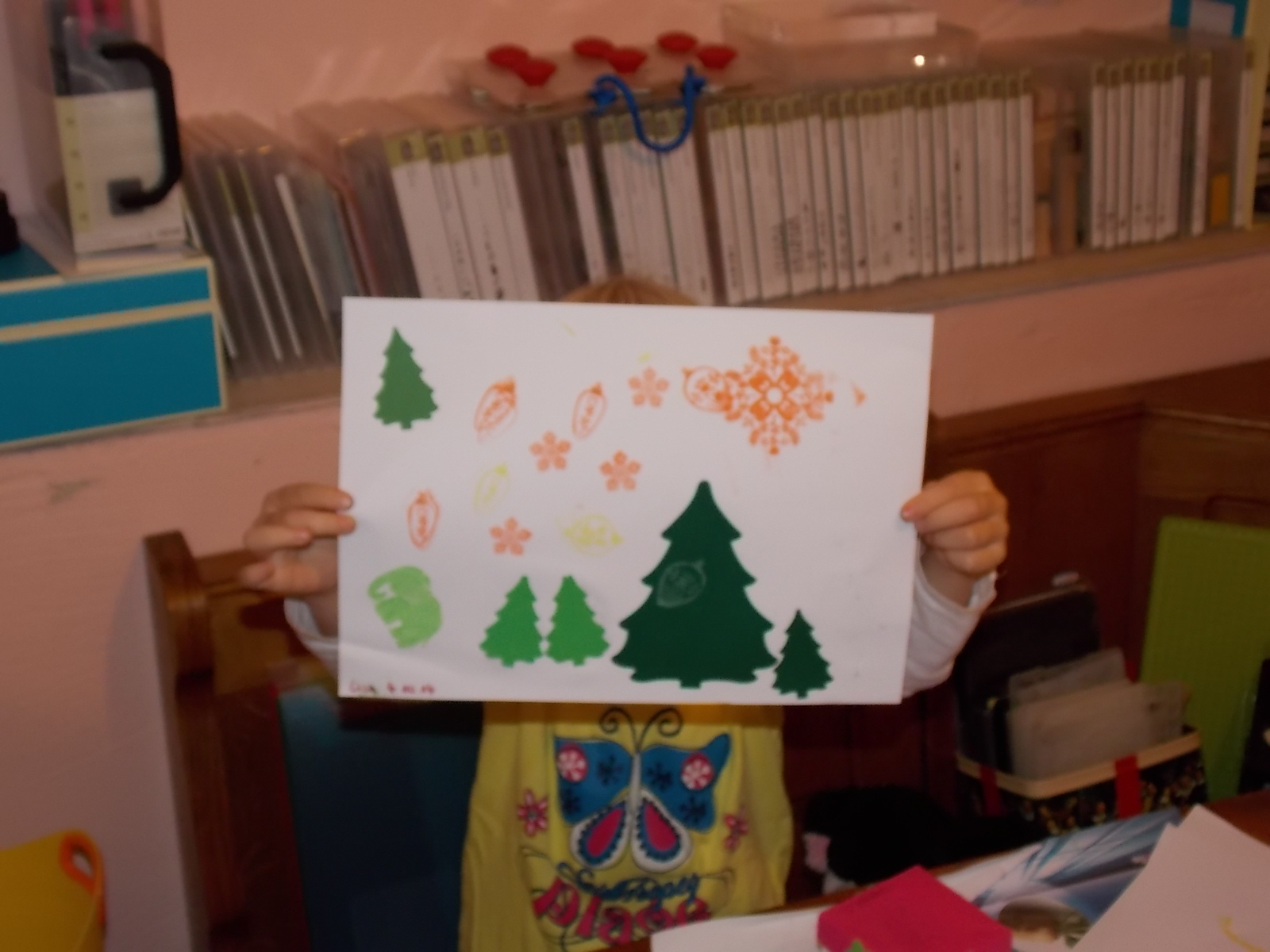 Die Tannenbaum Framlits haben es beiden besonders angetan. Auf dem oberen Bild sind die Tannenbäume verziert mit den „Kugeln“ aus dem Set „Frohes Fest“. Ich war begeistert wie gut die beiden mit den Stempeln umgehen konnten. Nach jeder Farbe wurde wie selbstverständlich der Stempel gereinigt und dann ging es weiter. Für 4 und 7 Jahre ist das echt super.