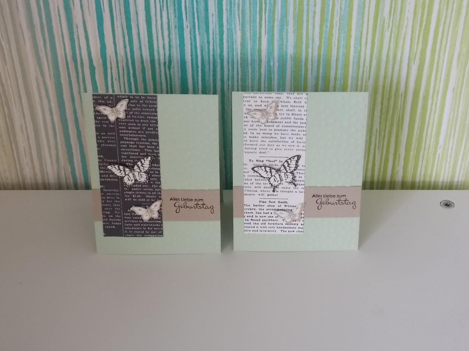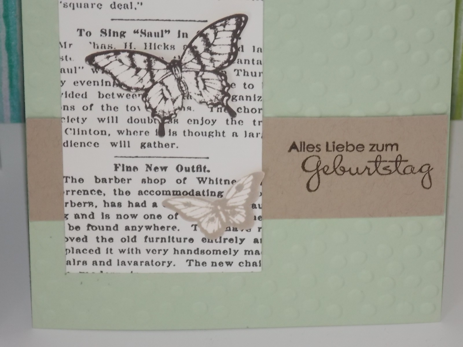 Verwendet habe ich Designpapier aus dem Vorjahreskatalog kombiniert mit Pistazie und Savanne. Die Schmetterlinge habe ich in Savanne und Espresso gestempelt auf Vanille Pur.