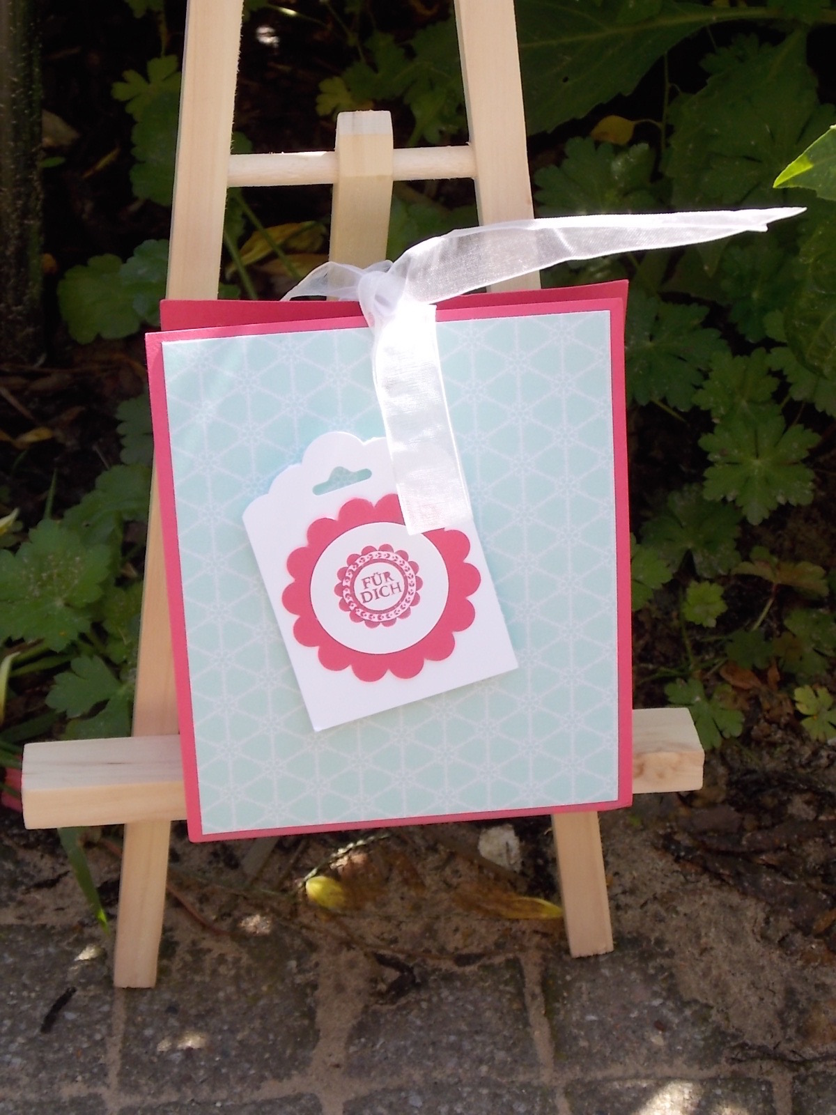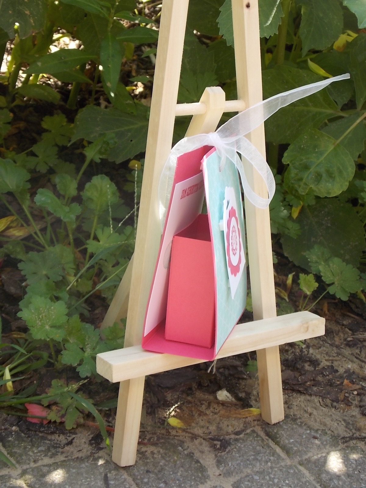 Die Verzierung Innen ist ein Stück heller Cardstock (hier Flüsterweiß) auf dem Platz für Glückwünsche und Grüße ist. Gegenüber kleben wir ein Stück Designpapier auf, dass nur oben und unten befestigt wird, so dass eine Packung Bärchen, Tee oder Cappuccino noch drunter geschoben werden kann.