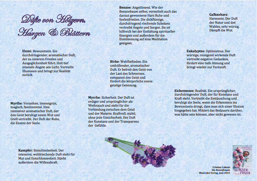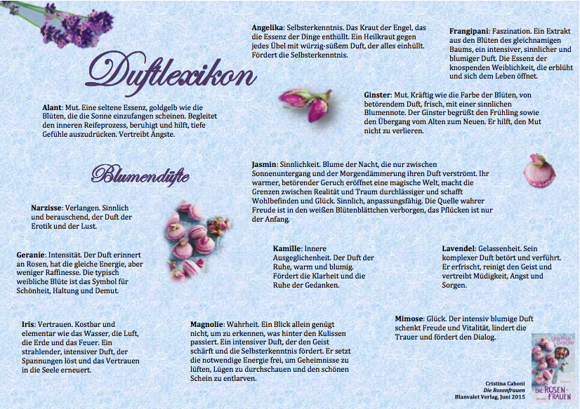 Jedes Kapitel wird mit einer Pflanze/ einem Duft eingeläutet. Hier das kleine Duftlexikon zum Buch.