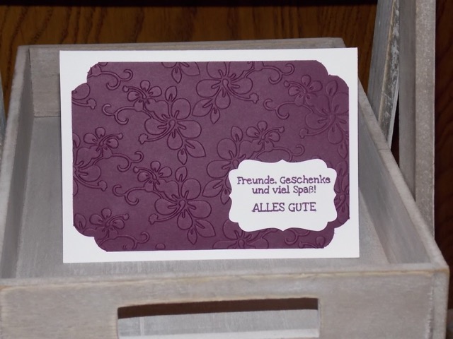 Nun ist die Woche mit den Blümchen und Bienchen fast vorbei. Zum Abschluss habe ich diese schlichte Stiefmütterchen Karte. Den geprägten Hintergrund habe ich mit der Trio Stanze abgerundet. Und dabei festgestellt, dass es fast der gleiche Abschluss wie bei dem Dekorativen Etikett ist. Also kam der Gruß passend auf das Etikett.