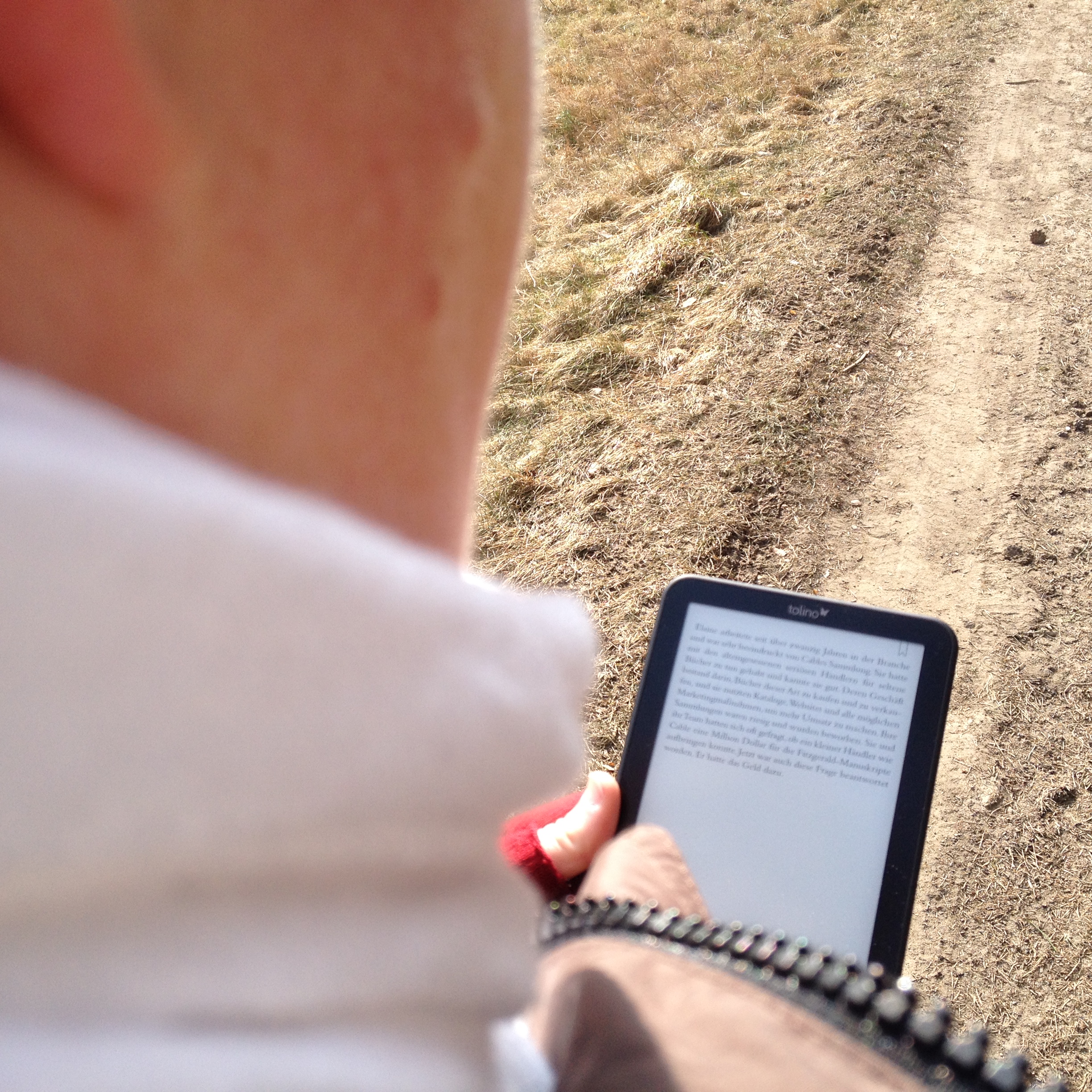 Kerstin Cornils auf einem Spaziergang durch den Wald. Sie hält einen Tolino Shine in der Hand und liest „Das Original“ von John Grisham