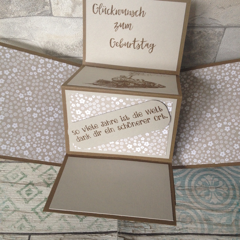 Für Auftragsarbeiten probiere ich gerne immer mal wieder was aus. Da ich die Pop Up Ziehharmonikakarte schon ewig nicht mehr gebastelt habe war das meine erste Wahl. Die inneren Felder von meiner Anleitung waren gerade groß genug für meinen Eisenbahnstempel. Also ran ans Werk.