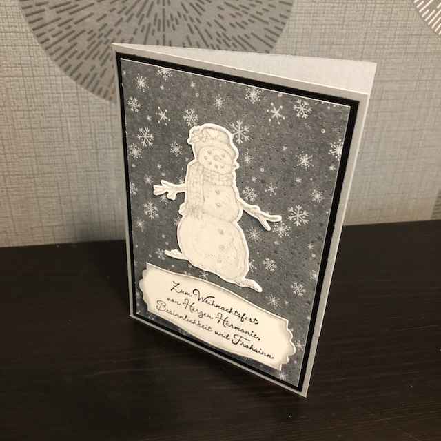Als Stempelset hatte ich „Verschneite Weihnachten“ in der Hand und fand in dem Designpapier mit den Schneeflocken den passenden Hintergrund. Das der Schneemann so schön nostalgisch daher kommt, habe ich ihn ganz dezent in Schiefergrau auf Flüsterweiß gestempelt. Der Spruch aus dem gleichen Stempelset durfte dann etwas kräftiger in schwarz hervorstechen. Das passende Etikett für den Text befindet sich bei den Stanzformen: Verschneite Zeiten, in dem auch die passende Stanzform für den Schneemann ist.