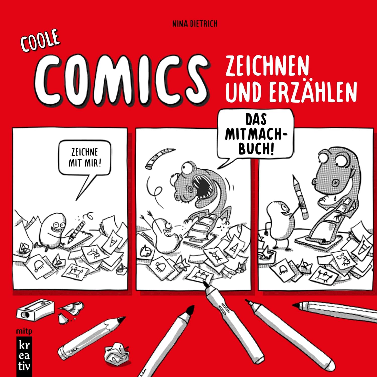 Coole Comics zeichnen und Erzählen von Nina Dietrich erschien im mitp Verlag. Das Buch richtet sich an alle, die selbst einen Comic zeichnen möchten. Sie werden von der Autorin an die Hand genommen aktiv das Buch zu lesen. Es ist ein Mitmachbuch, in dem sehr viel Platz für eigene kreative Ideen ist und so kannst du deine ersten Gehversuche direkt im Buch absolvieren.
