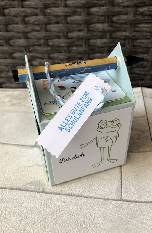 Mit dem Falz- und Stanzbrett für Geschenktüten lassen sich nicht nur kleine und größere Tüten aus Papier basteln, sondern auch diese kleinen süßen Schultaschen zur Einschulung. In ähnlicher Form durftest du diese kleinen Schulranzen schon öfter auf meinem Blog bewundern.