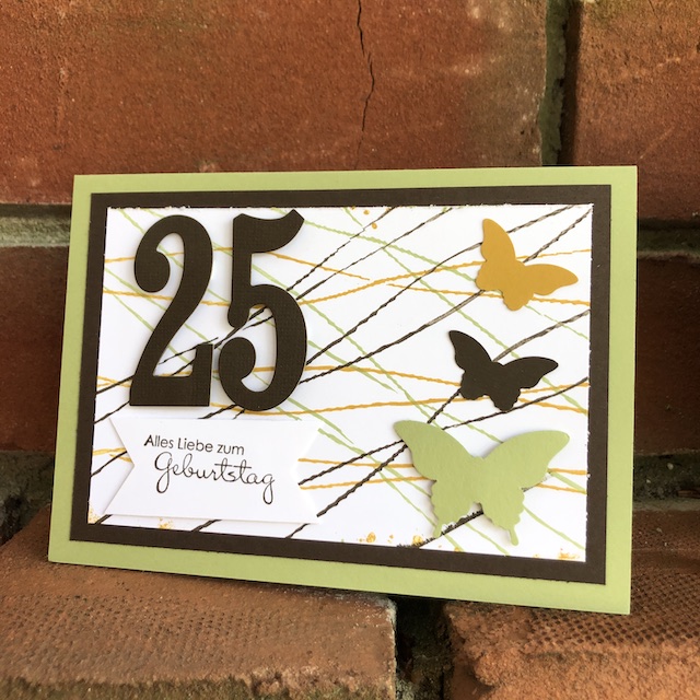 Zu sehen ist eine Glückwunschkarte zum 25. Geburtstag. Die Grundkarte ist in einem hellen Grünton gehalten. Auf die Karte ist ein weißes Stück Papier mit brauner Umrandung geklebt. In gelb, braun und grün sind Linien auf dem weißen Papier, dadrauf klebt eine große 25 in dunkel braun und drei Schmetterlinge in gelb, grün und braun. Der Text auf der Karte lautet: Alles Liebe zum Geburtstag.