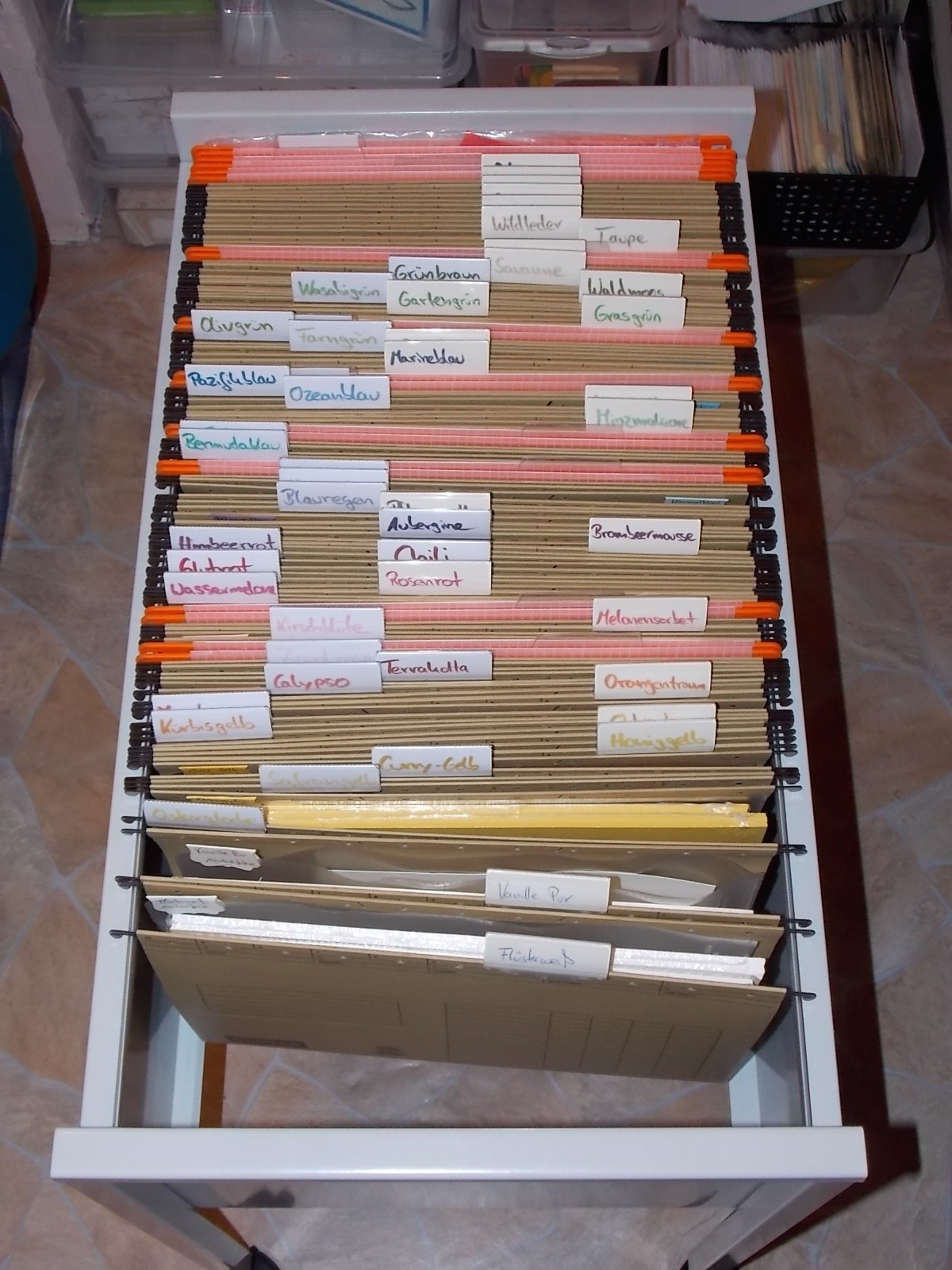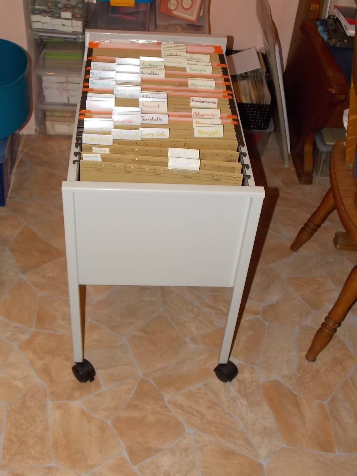 Ich bin jetzt schon sehr zufrieden mit meinem neuen Ordnungssystem im Bastelkeller. Jetzt muss ich es nur noch schaffen die Wand beim Heizungskörper weiß zu streichen. Irgendwie bin ich dazu immer noch nicht gekommen. Denn erst dann kann ich den Schreibtisch rauswerfen und gegen Regalböden an der Wand tauschen. Man kann nie genug Abstellflächen in einem Kreativen Arbeitszimmer haben.