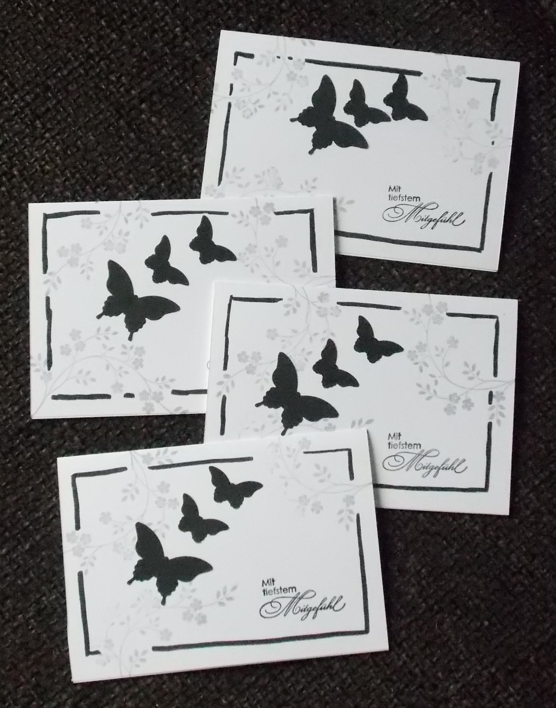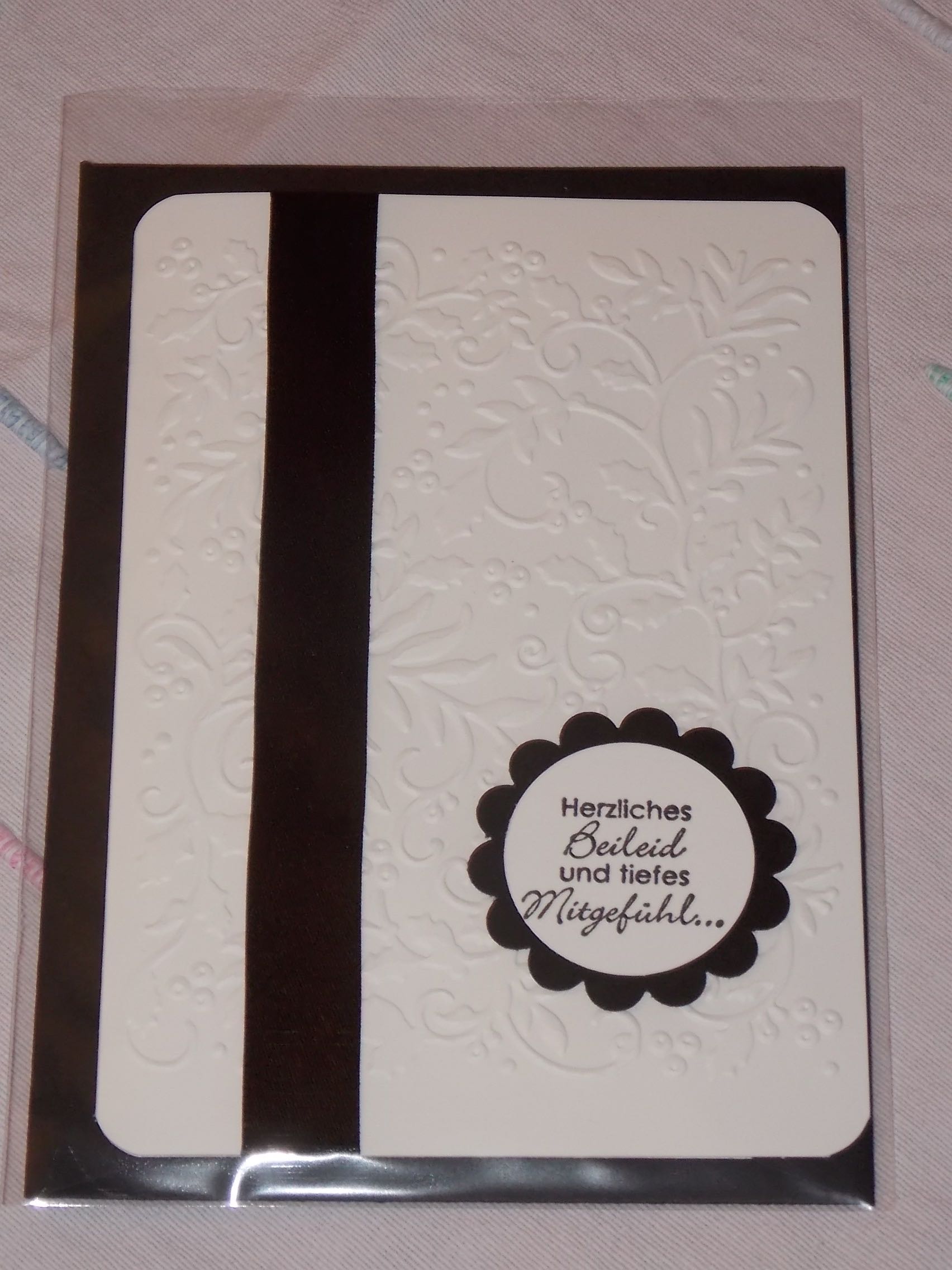 Die dritte und letzte Trauerkarte dieser Woche hat ebenfalls eine Prägung als Hintergrund. Man kann die Ranken erahnen.