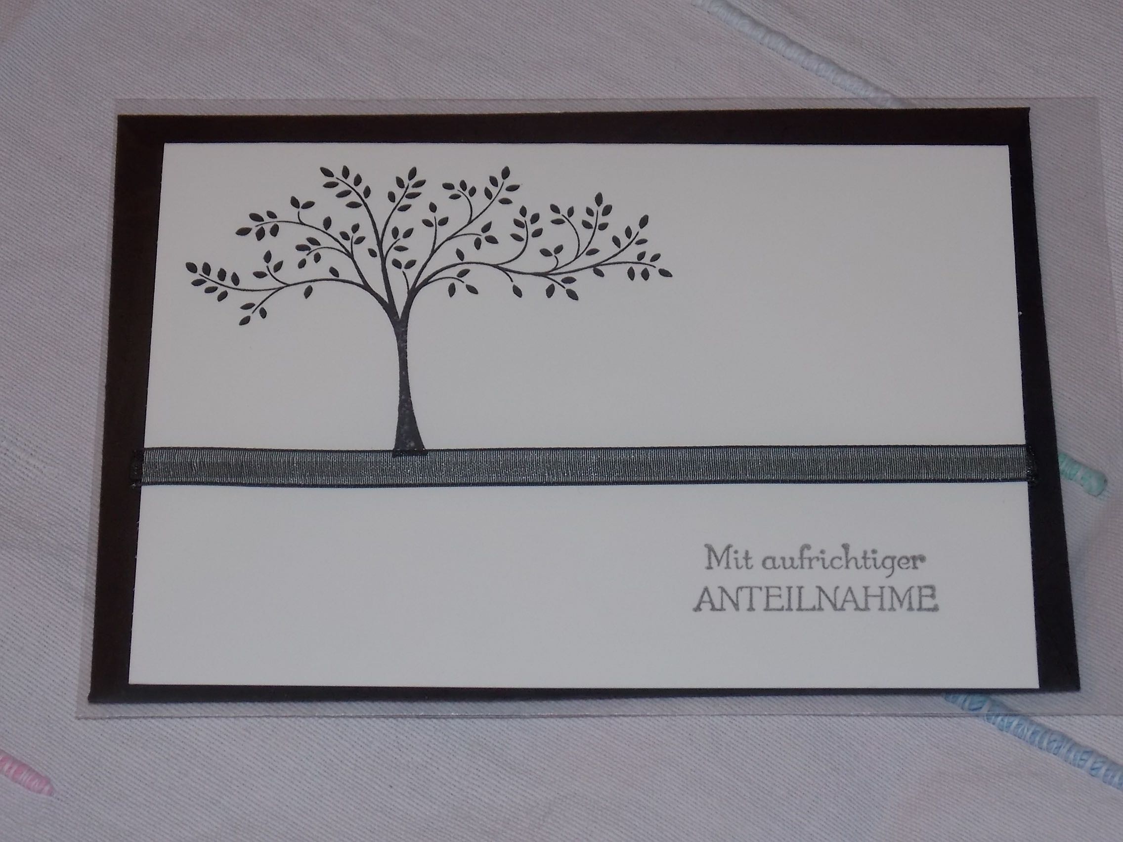 Diese Karte habe ich ganz ähnlich schon mal gezeigt. Diesmal habe ich statt einem schwarzen Papierstreifen ein schwarzes durchscheinendes Band verwendet. Das Band trennt die Welt der Lebenden mit dem Baum von der Welt der Toten. Wo auch immer diese sein mag.
