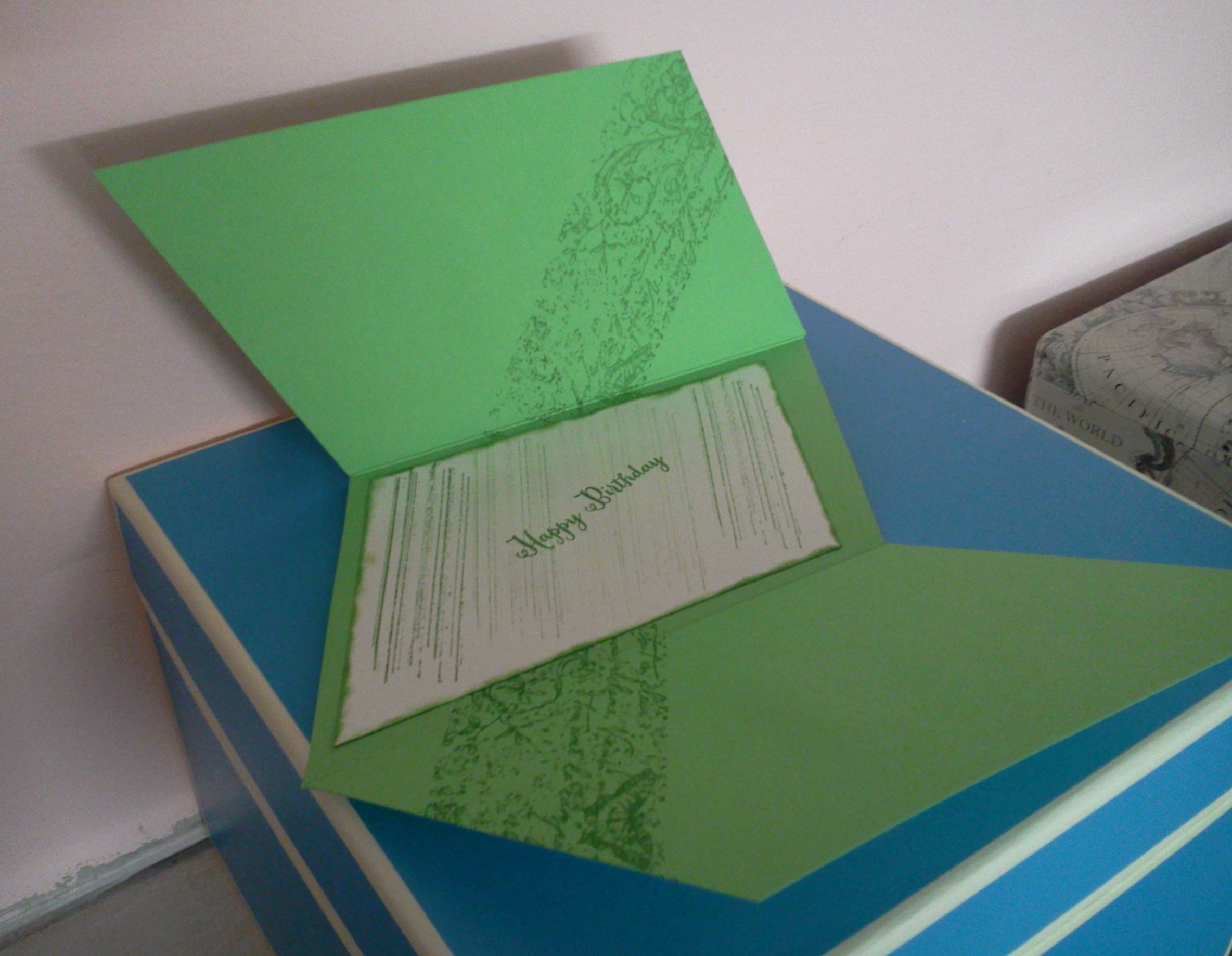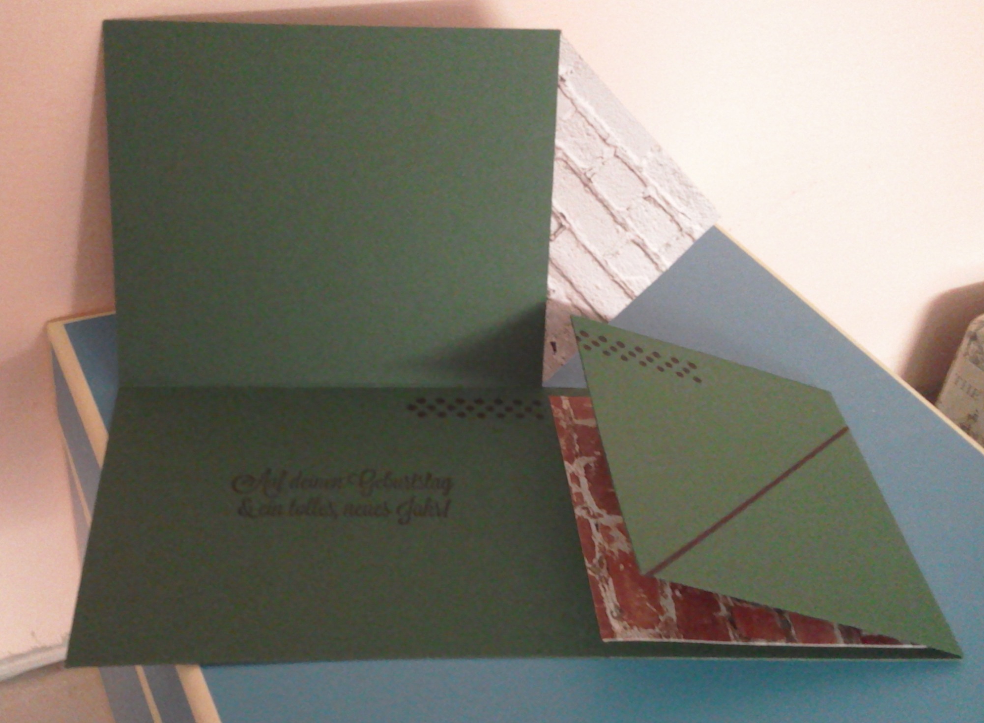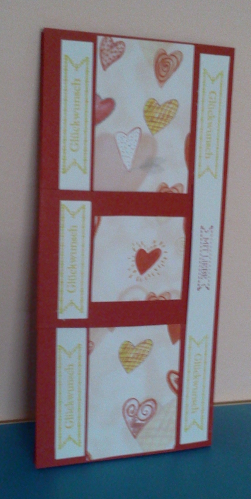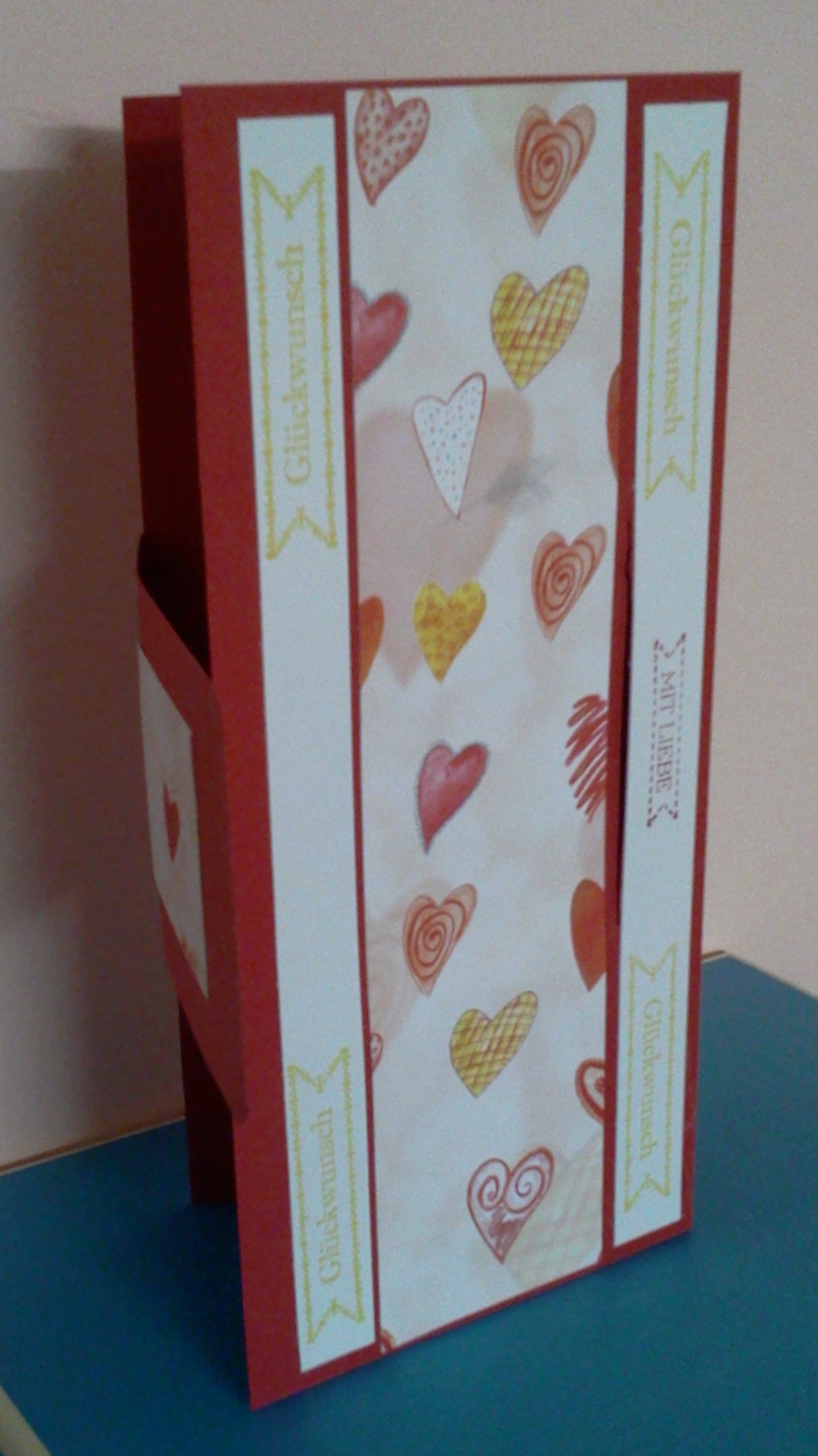 Hier kann man angedeutet eine offene Karte sehen. Mit dem einzelnen Herz lässt sich die Karte fest verschließen. Die Karte eignet sich auch gut zum Geld verschenken. Das kann man dann gut Innen anbringen.