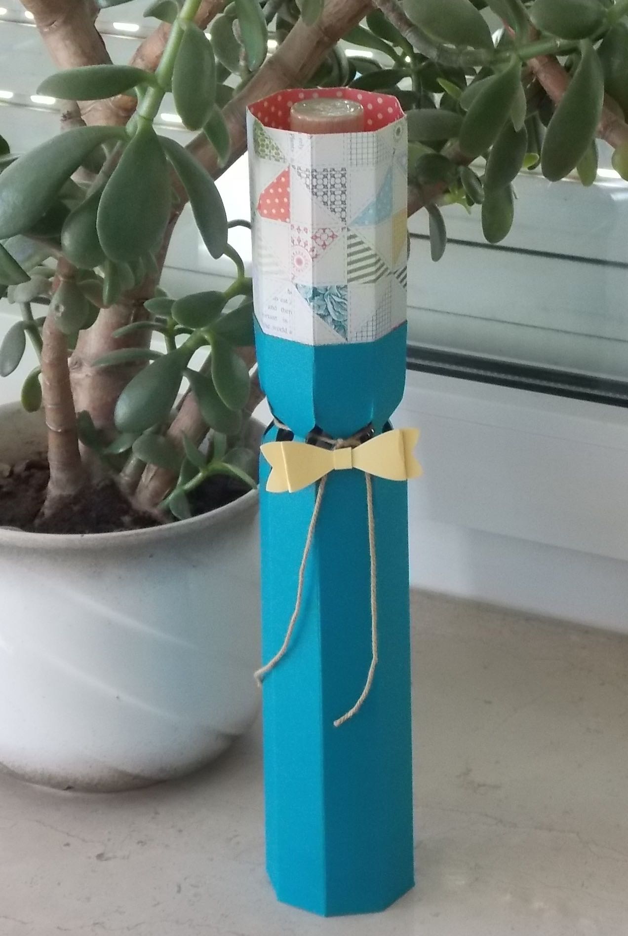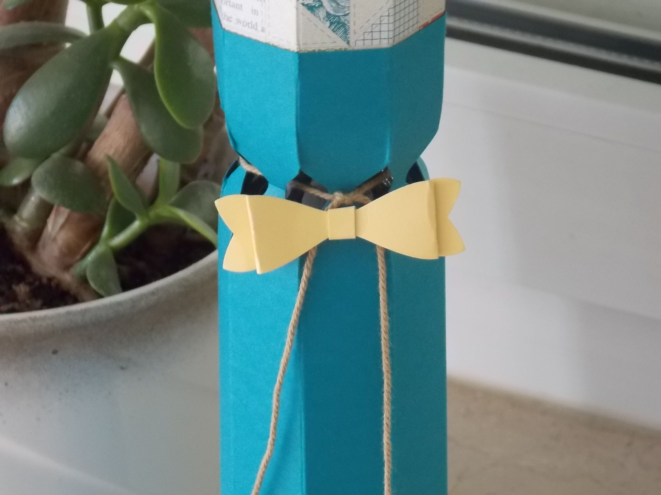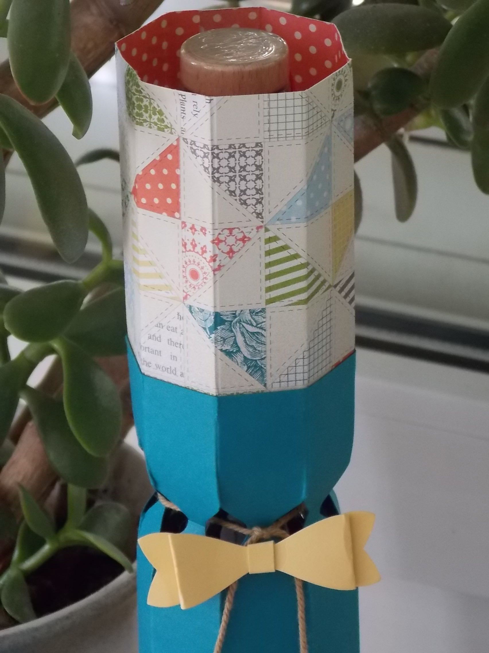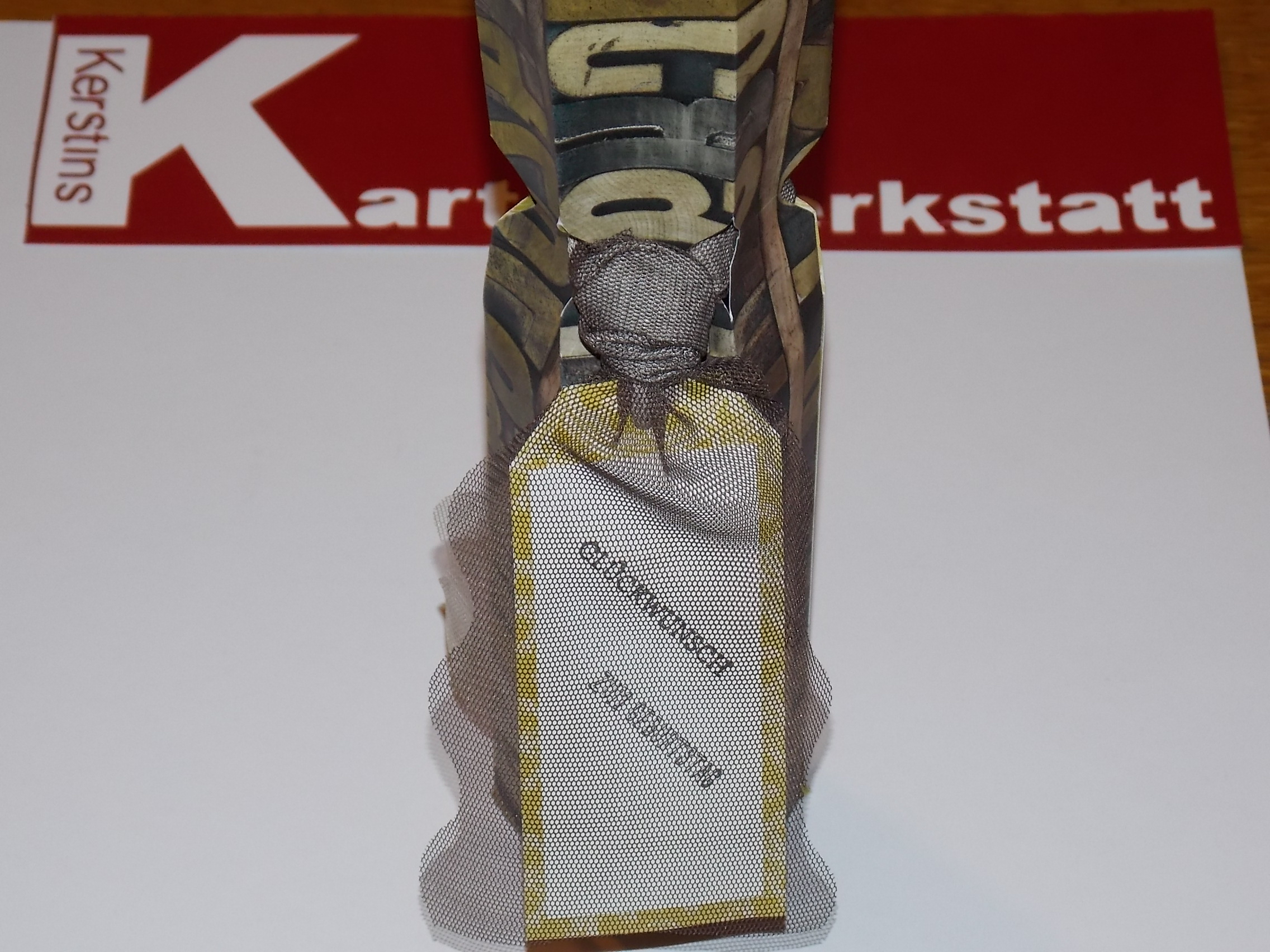 Den Anhänger in Form einer Flasche für die Glückwünsche muss ich noch mal etwas perfektionieren. Aber mein Mann hat Ideen für Geschenke immer kurz vor knapp und auf die Schnelle ist der Anhänger nicht fotogen genug gewesen, um eine Nahaufnahme zu machen.