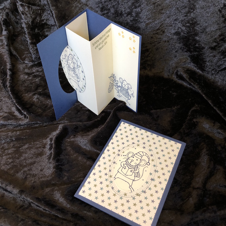 Wenn man den Dreh erst mal raus hat, geht die Karte ganz einfach. Und man kann das Fenster in jeder beliebigen Form und Größe gestalten. Ich habe mich bei der Größe jeweils an die Stempel gehalten. Oder besser gesagt, ich wollte meine Stickrahmen einfach mal alle durchprobieren und habe passende Stempel gesucht.