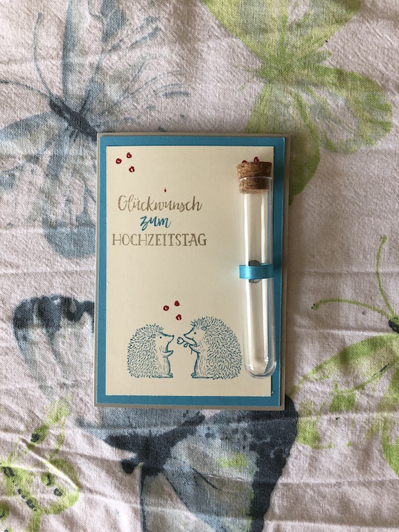 In meinem großen Papierfundus fand ich dieses Designpapier, das den Blick des Betrachters direkt in die Mitte lenkt. Aus dem gleichen Designpapier habe ich die 17 ausgestanzt und diese konträr zu den Farben aufgeklebt. Dann kam noch ein Herzlichen Glückwunsch mit auf die Karte und fertig war mein Geldgeschenk.