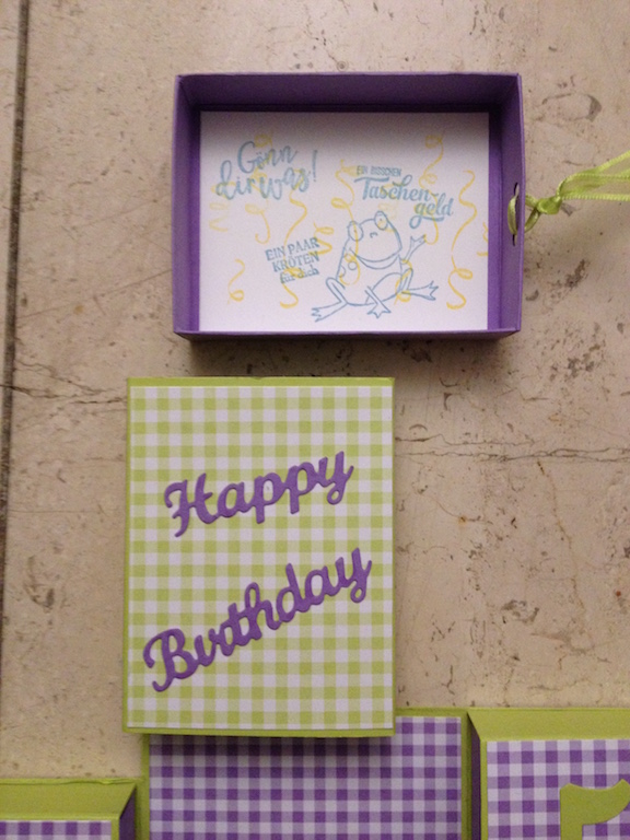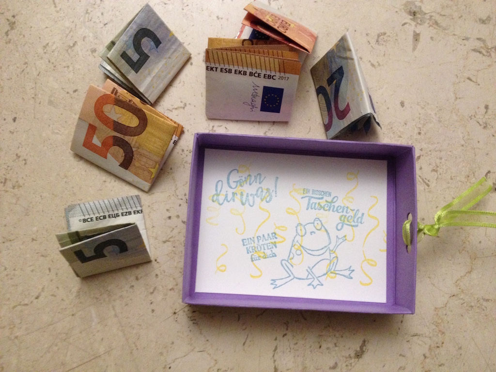 Also habe ich mich in meinen Bastelkeller begeben und geschaut, welche Stempelsets wohl zum Führerschein passen. Da stieß mir sofort „Ride with me“ von Stampin‘ Up ins Auge. Gewünscht war ein Frosch. Der fand sich natürlich schnell aus dem Set der letzten Sale-a-Bration. Und schwups war eine Geldgeschenk Karte zum Führerschein fertig.