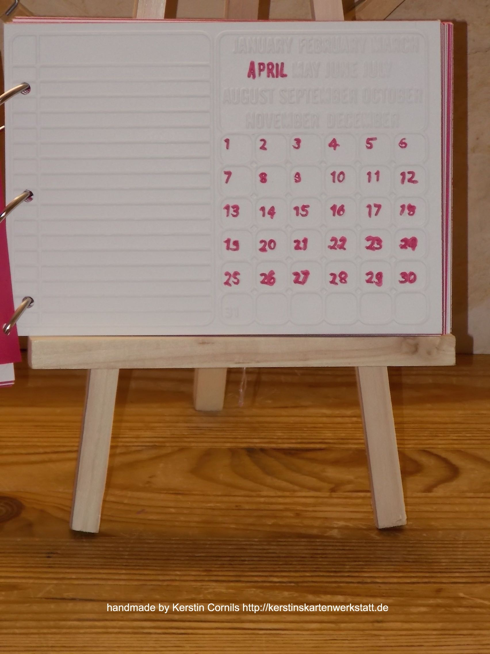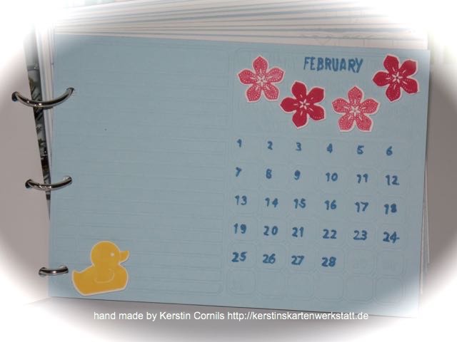 Die Kalenderseiten habe ich geprägt. So sind jeweils links geprägte Linien für kleine Notizen und rechts ist der geprägte Kalender. Ich habe den Monaten entsprechend die Zahlen eingefärbt.