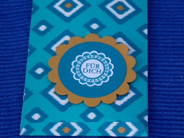 Als Gruß habe ich wieder „Eine runde Sache“ gewählt. Das Stempelset passt einfach immer. Farblich abgestimmt ist der Wellenkreis (1 3/4) in Ockerbraun, darüber der Kreis (1 3/8) in Petrol und in Flüsterweiß mit Petrol bestempelt ist der Wellenkreis (7/8).