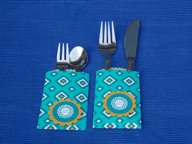 Die Tüte eignet sich zum Beispiel als Besteck-Tasche. Hier jeweils ein Foto vom Essbesteck und vom Kaffeebesteck. Letzteres geht fast etwas unter in der Tüte.