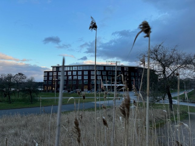 Da wir heute zwar schon viel auf den Beinen waren, aber die meiste Zeit nur drinnen, ließen wir mein Auto in der Tiefgarage stehen und nahmen nur unser Gepäck mit. An der Phaeno führte uns direkt eine Brücke über den Mittellandkanal, vorbei an der Autostadt und der Volkswagen Arena gelangten wir auf das Gelände vom Allerpark, auf dem sich auch unser Hotel befand. Schon von weitem konnten wir das Courtyard by Marriotts sehen. Mein erster Gedanke war: hoffentlich haben wir ein Zimmer mit Blick auf den See. Meine Hoffnung sollte sich mehr als erfüllen. Der Check Inn ging zügig von statten und mit unserer Zimmerkarte ging es dann ab in den Fahrstuhl nach ganz oben. Die Vorfreude stieg ungemein. Beim Betreten des Zimmers waren wir einfach nur begeistert. Der See lag direkt vor uns. Im Sommer hätte man bestimmt den Tag sehr schön auf unserem Balkon ausklingen lassen. So haben wir eingemummelt in unsere Jacken einfach einen Moment den Ausblick genossen. Bei dem Anblick hatte ich das Gefühl mitten im Grünen zu sein, obwohl wir ja nur knapp 2 km von der Phaeno und somit der Stadt entfernt waren. Zum Seele baumeln lassen habe ich mich noch kurz an den See begeben, während mein Mann einfach die Füße hochlegte.