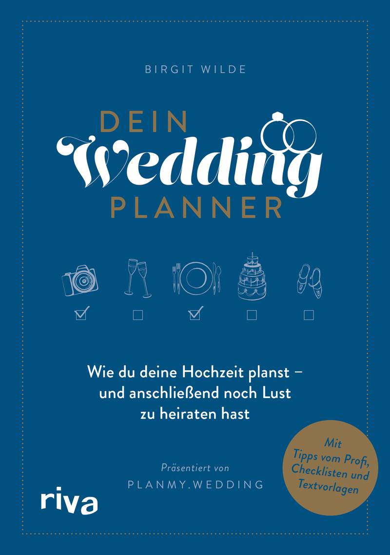 Dein Wedding Planner – Wie du deine Hochzeit planst – und anschließend noch Lust zu heiraten hast von Birgit Wilde ist im Riva Verlag erschienen. Damit das Buch dich bei deiner Planung in jeder Situation begleiten kann, ist der Einband aus einem widerstandsfähigen Material gearbeitet. Zusätzlich gibt es ein blaues Leseband im Buch, damit du einfach zu deinem aktuellen Planungsschritt gelangen kannst.