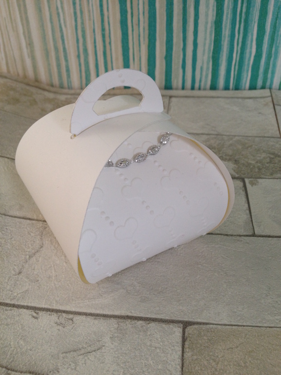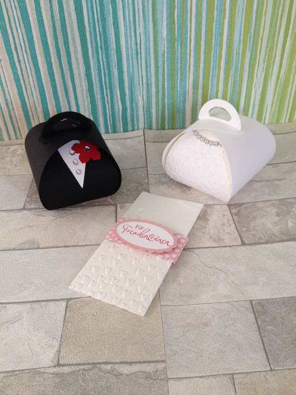 Heute habe ich eine zweite Variante meine Braut und Bräutigam Zierschachteln für dich. Der Bräutigam trägt hier eine kleine Blume am Revers. Die Braut hat ein mit Ranken geprägtes Kleid und eine kleine Glitzerkette.