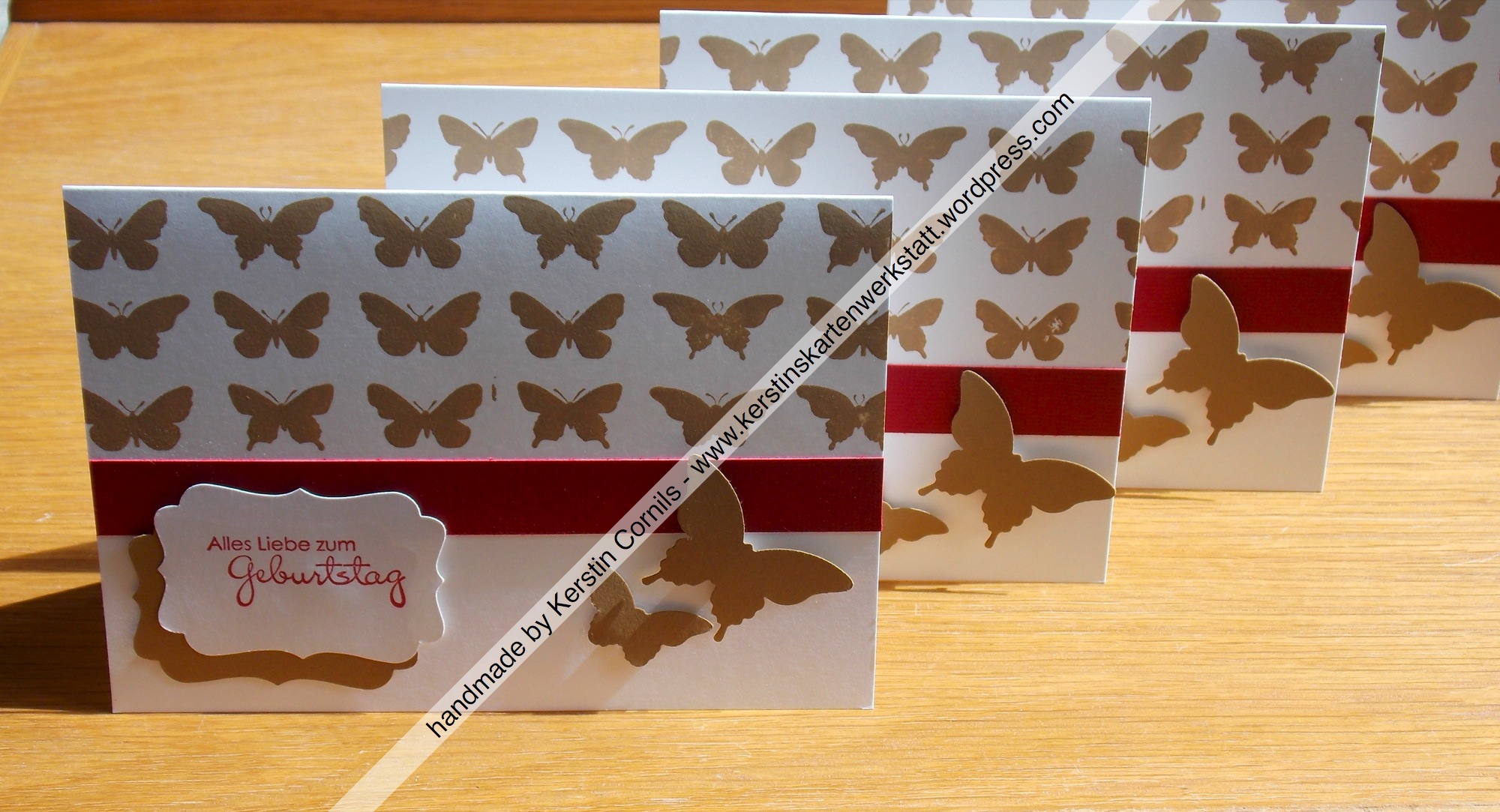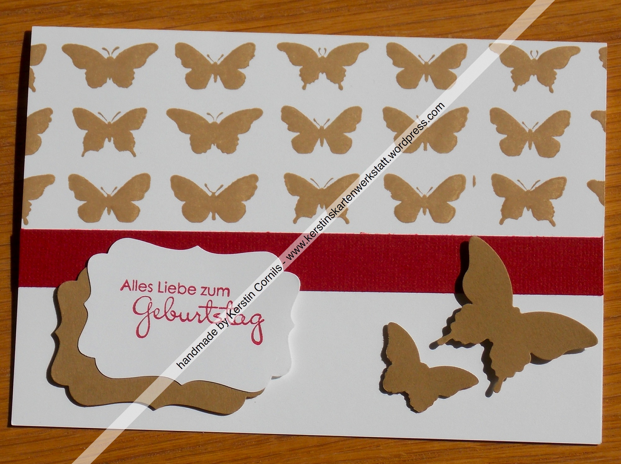 Also dürfen Geburtstagskarten mit Schmetterlingen in meinem Sortiment auch nicht fehlen. Heute in den Farben Kandiszucker und Chili. Eine gewagte Farbkombination auf den ersten Blick. Aber ich hatte in meiner Mittagspausen-Aktions-Tasche keine anderen Farben mehr. Und auf den zweiten Blick finde ich die Variante sehr gut.