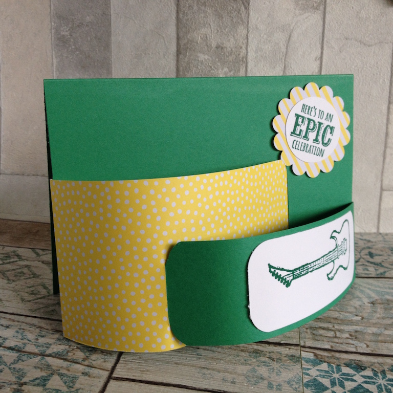 Beim Kartenformat habe ich lange in meinen Anleitungsbüchern geblättert, denn ich wollte mal wieder was anderes machen. Stehen geblieben bin ich dann bei den Anleitungen der Jever Workshops. Die „Bendi Fold Karte“ steht durch ihren 3-D-Effekt gut alleine und kann so auch dekorativ ins Regal gestellt werden. Im Innenteil habe ich eine kleine Tasche angebracht, um den Geldschein für die Gitarre dort sicher zu verwahren.