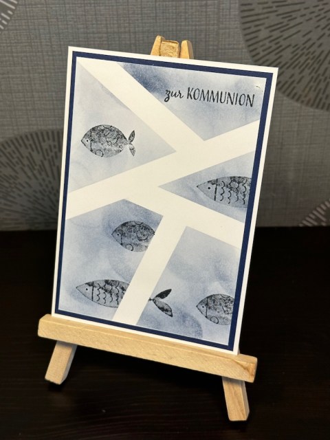 Über die Seifenblasen als Hintergrund bin ich rein zufällig gestolpert. Eine Anleitung für die Seifenblasen findest du auf der Technikseite von Anne-Kathrin. Ich habe die Technik für neue Karten zur Kommunion genutzt und sie mit einem Schwarm Fischen kombiniert. Ich muss sagen, die Technik gefällt mir sehr gut. Allerdings bin ich mit der Wahl meiner Farben nicht ganz zu frieden. Beim nächsten Mal werde ich etwas hellere Farbtöne wählen, aber fürs erste gefällt mir das Ergebnis ganz gut.