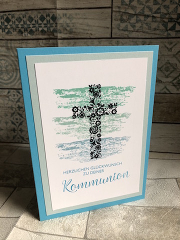 Über die Seifenblasen als Hintergrund bin ich rein zufällig gestolpert. Eine Anleitung für die Seifenblasen findest du auf der Technikseite von Anne-Kathrin. Ich habe die Technik für neue Karten zur Kommunion genutzt und sie mit einem Schwarm Fischen kombiniert. Ich muss sagen, die Technik gefällt mir sehr gut. Allerdings bin ich mit der Wahl meiner Farben nicht ganz zu frieden. Beim nächsten Mal werde ich etwas hellere Farbtöne wählen, aber fürs erste gefällt mir das Ergebnis ganz gut.