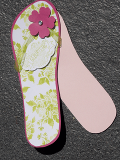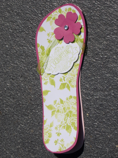 Die Vorlage zur Karte habe ich in einer Zeitschrift gefunden. Die Flip-Flop-Karte besteht aus einer doppelten Sohle (hier in Sommerbeere und Puderrosa) dekoriert mit dem Designpapier Florale Eleganz in Limette. Das Riemchen wird von der Blüte in Sommerbeere und dem Clip gehalten.