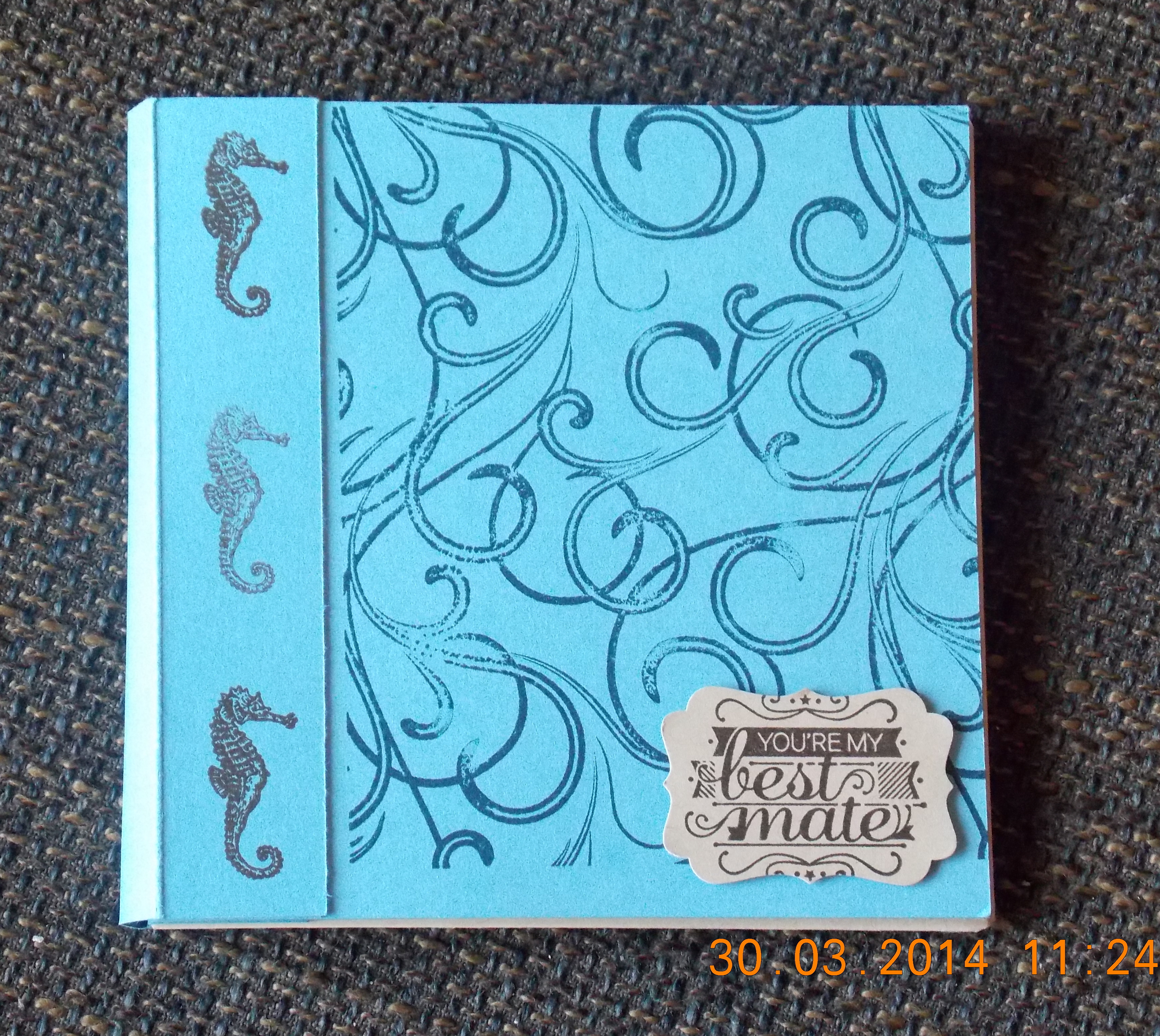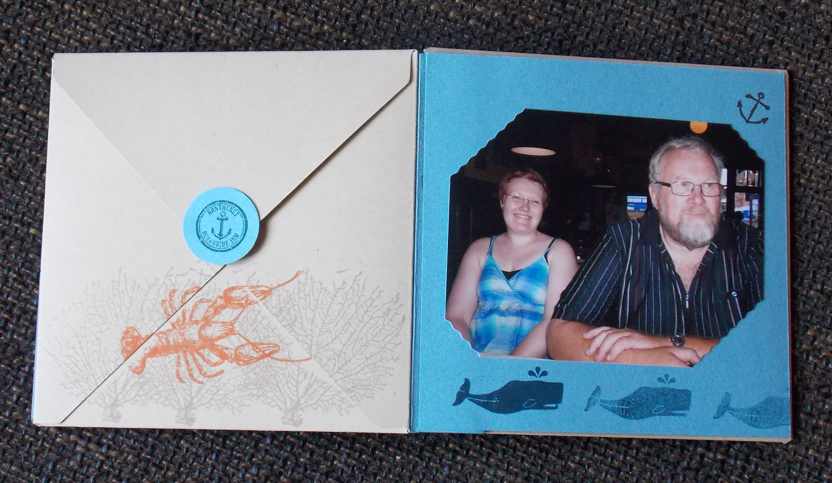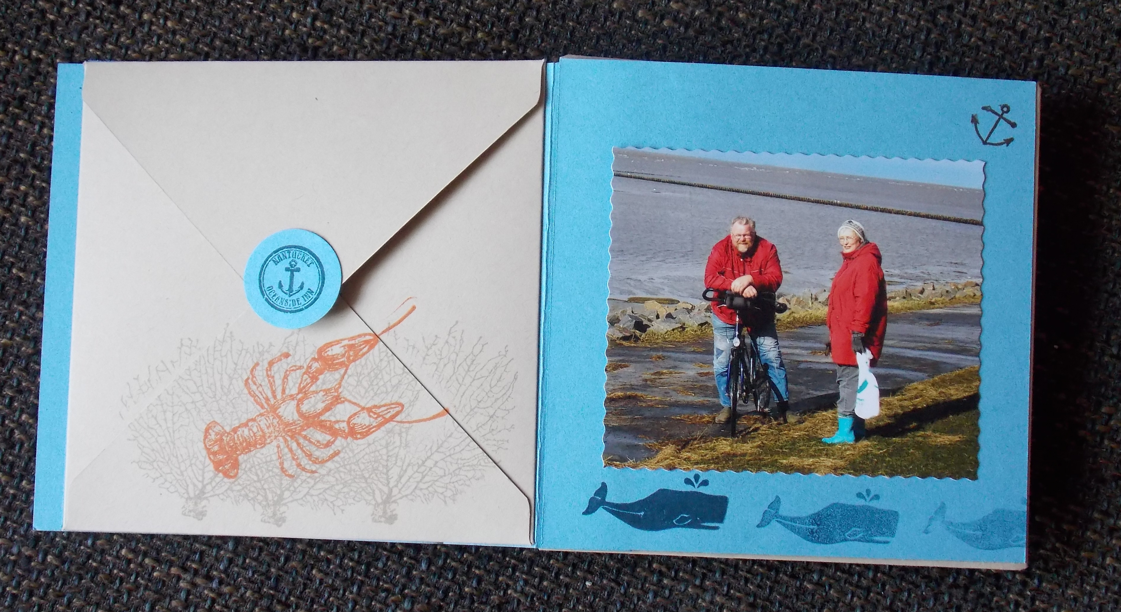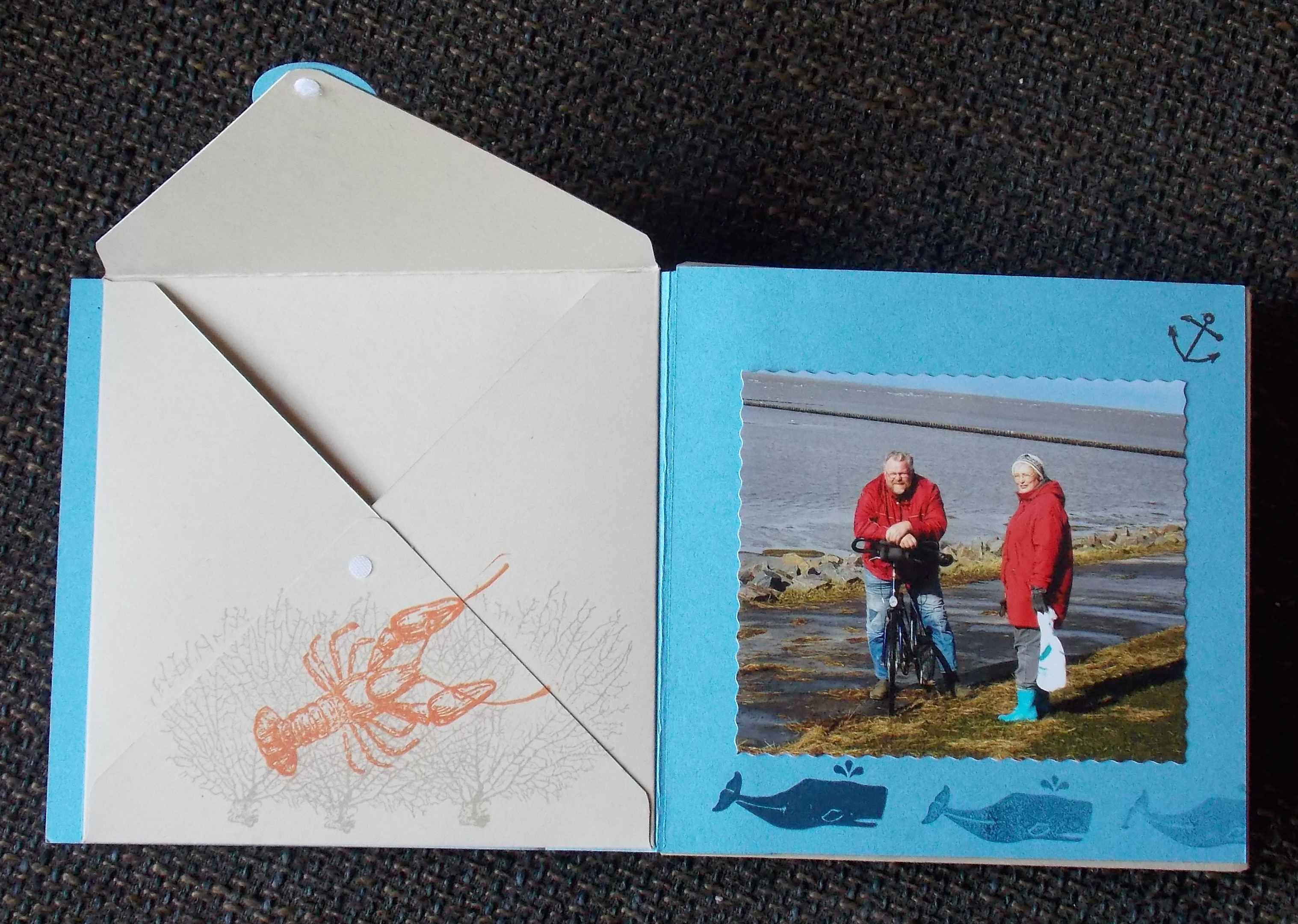 Maritime Motive und ich sind die absoluten Freunde. So habe ich mich sehr über das Projekt von Anja gefreut. Sie hatte für ihr Album ein Designpapier mit Wellen und maritimen Motiven ausgewählt. Das Album lässt sich mit Schwung öffnen und so offenbart sich direkt der Mittelteil.