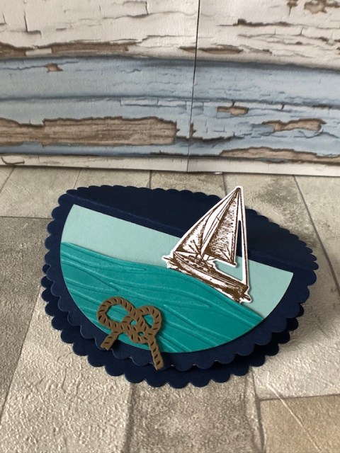 Du brauchst dafür bloß eine möglichst große (Wellen-)Kreis Stanzform und passend dazu eine etwas kleinere (Wellen-)Kreis Stanzform. Und dann sind deiner Kreativität keine Grenzen gesetzt. Ich habe hier mit den Farben Aquamarin und Bermudablau gearbeitet auf einem Marineblauen Grund. Für die Holzoptik und das Seil habe ich die Farbe Wildleder gewählt. Um im maritimen Look zu bleiben musste natürlich das Stempelset „Setz die Segel“ mit den passenden Framlits her halten. Dann noch die Wellen Prägeform genutzt und fertig ist meine runde Easel Card.
