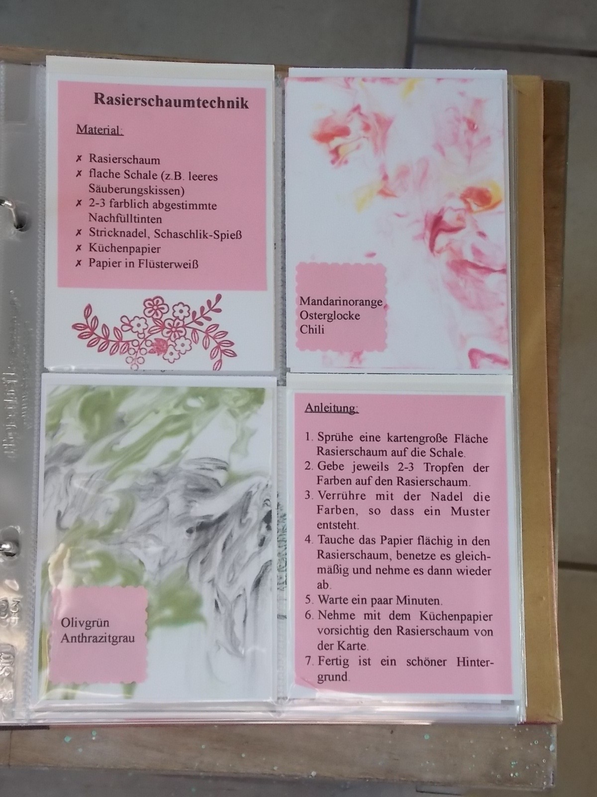 Der schöne Hintergrund entstammt dann meiner Lieblingstechnik. Auf einer wasserfesten Unterlage habe ich ganz viel Rasierschaum (Meine Anleitung zur Rasierschaumtechnik) verteilt und dann die Nachfüller Sommerbeere, Limette und Pfirsich Pur darauf getropft. Mit einem Zahnstocher habe ich die Farbe verteilt. Mit ein bisschen Übung kann man so ganz schöne Muster bekommen.