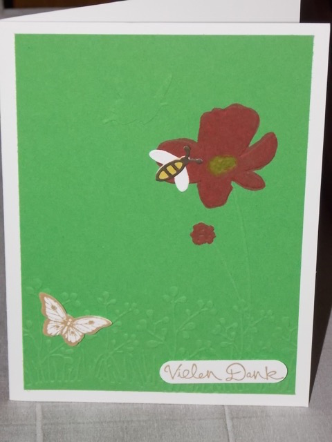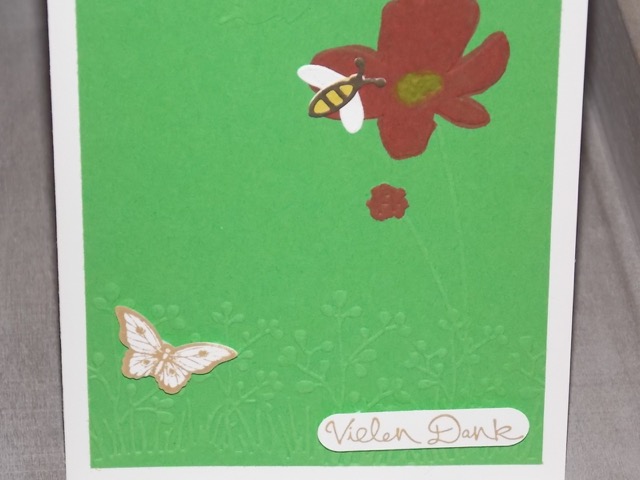 Schmetterlinge schaffen es bei mir irgendwie immer auf eine Trauerkarte. Ich finde sie einfach ein schönes Accessoire und eine schöne Vorstellung, dass die Verschiedenen leicht wie ein Schmetterling gen Himmel fliegen. Hier habe ich sie kombiniert mit einer schlichten Karte. Die Front ist zur Hälfte geprägt und zur Hälfte glatt. Die beiden Teile sind durch ein schwarzes Band voneinander getrennt.