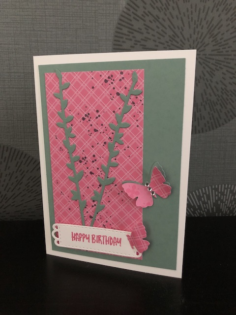 Im Mittelpunkt steht ein gestempelter Baum, an dem sieben bunte Schmetterlinge vorbeifliegen. Sie stehen für Erinnerungen, für die Leichtigkeit der Seele und für die Hoffnung auf ein Wiedersehen. Der schwarze Rahmen greift das traditionelle Layout einer Trauerkarte auf und verleiht ihr dennoch eine warme, persönliche Note.