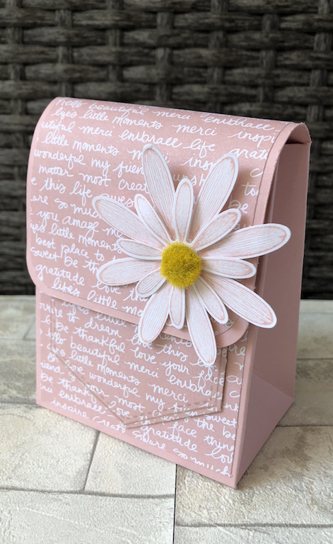 Gefertigt aus festem Farbkarton und verziert mit einem Designpapier voller Schriftzüge, erinnert die kleine Tasche an die aufregende Schulzeit. Besonders charmant: Die Klappe ist mit kleinen Gänseblümchen dekoriert, was dem Rucksack eine verspielte und liebevolle Note verleiht.
