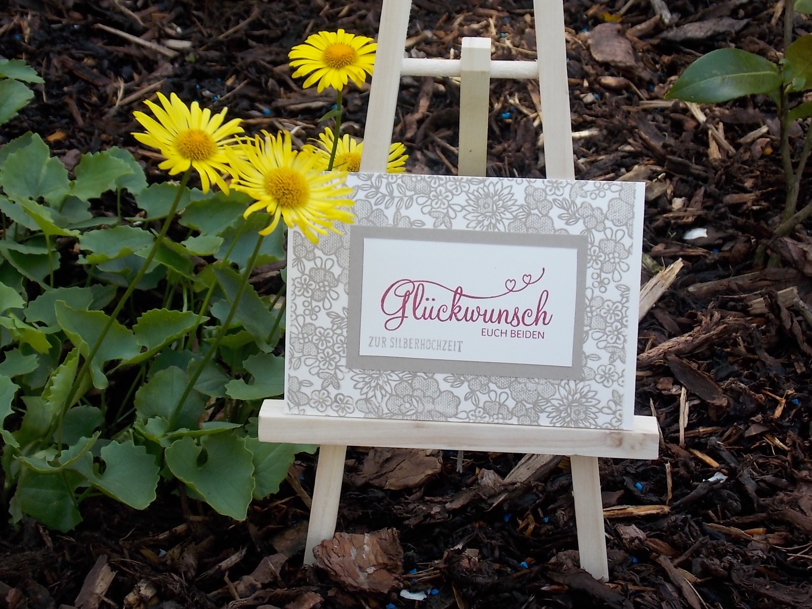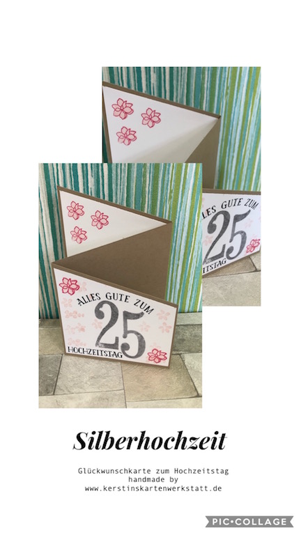Den Auftrag für diese ganz spezielle Karte zum 25. Hochzeitstag bekam ich von einer Arbeitskollegin. Kerstin, kannst du mir bitte ganz spontan eine Karte basteln. Ich bräuchte die schon zu nächster Woche. Mit diesen Worten kam meine Kollegin in mein „Büro“. Da ich dir die heutige Karte präsentiere kannst du dir meine Antwort denken. Und dann kam die Geschichte: Jedes Jahr am Martinstag kommt das Silberpaar mit Pizza zu besuch. Meine Kollegin ging auch noch weiter ins Detail. Es hörte sich für mich einfach schön an.