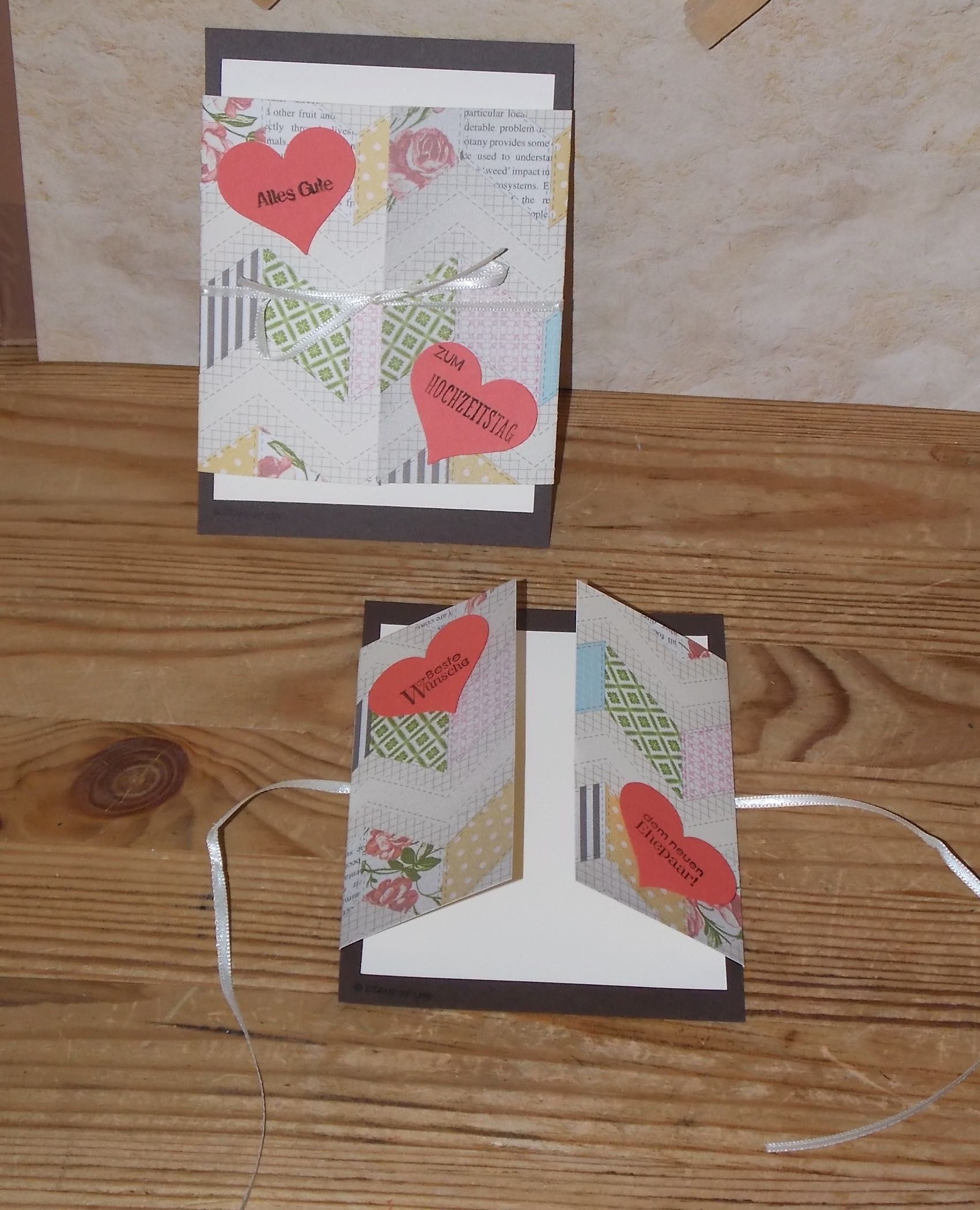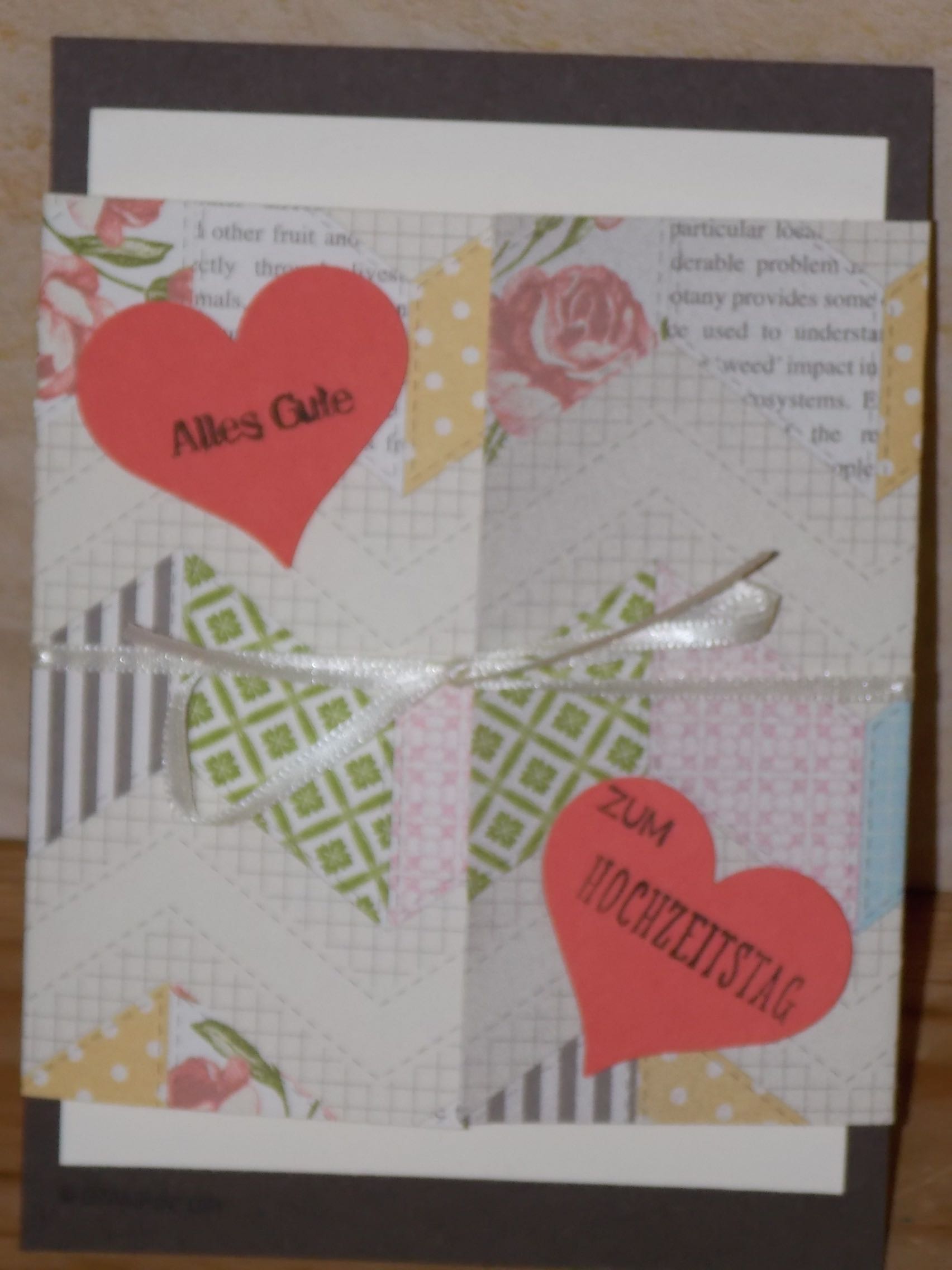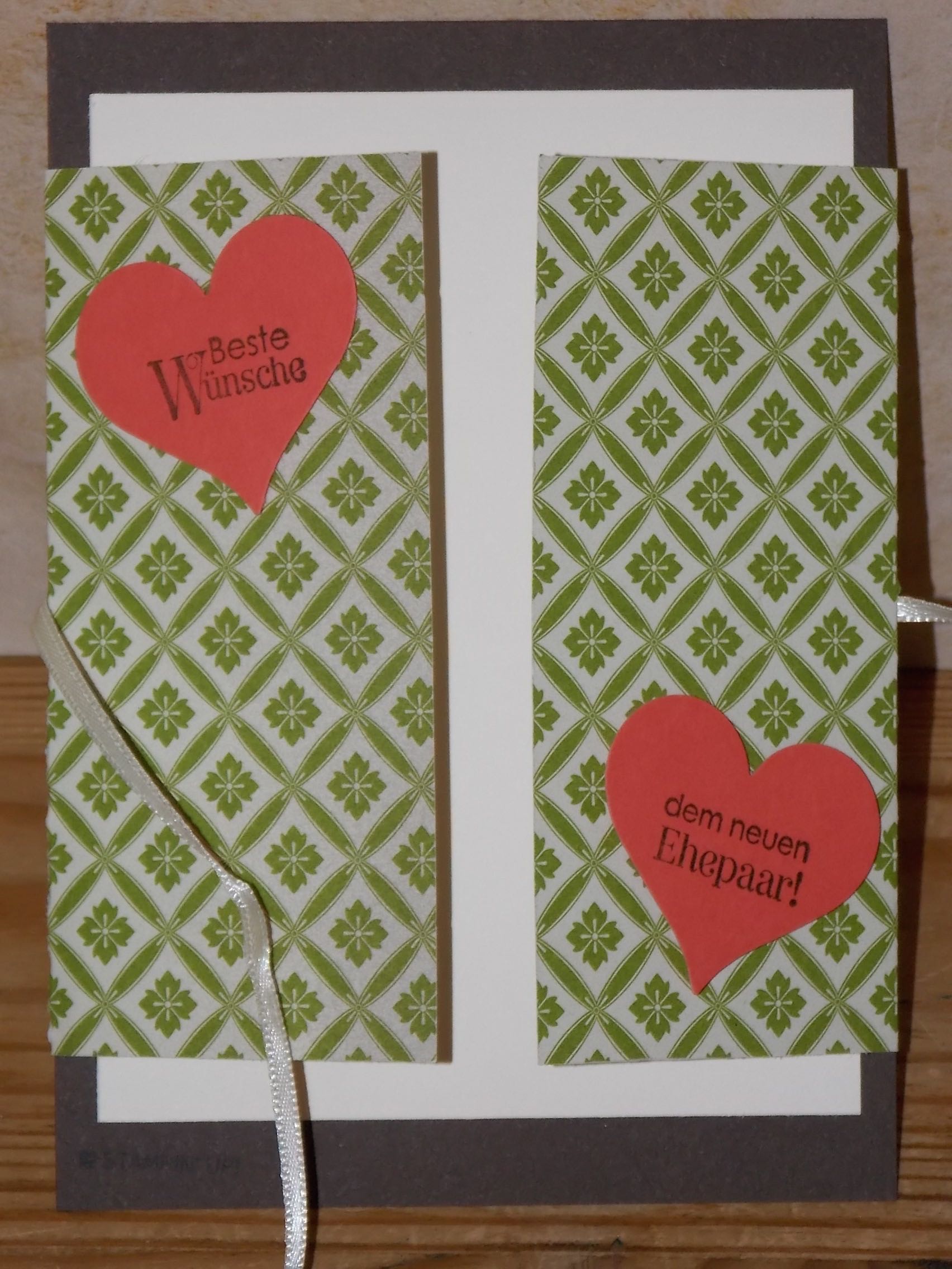 Ich habe eine ganze Kiste voller Streichel-Papiere. Mein Ziel, bis zum nächsten Jahreskatalog den Vorrat mindestens um die Hälfte zu reduzieren. Den Anfang machten am Wochenende 3 Bögen für Hochzeitskarten. Ich musste mal was neues ausprobieren. Raus kam dieses Kartenformat: