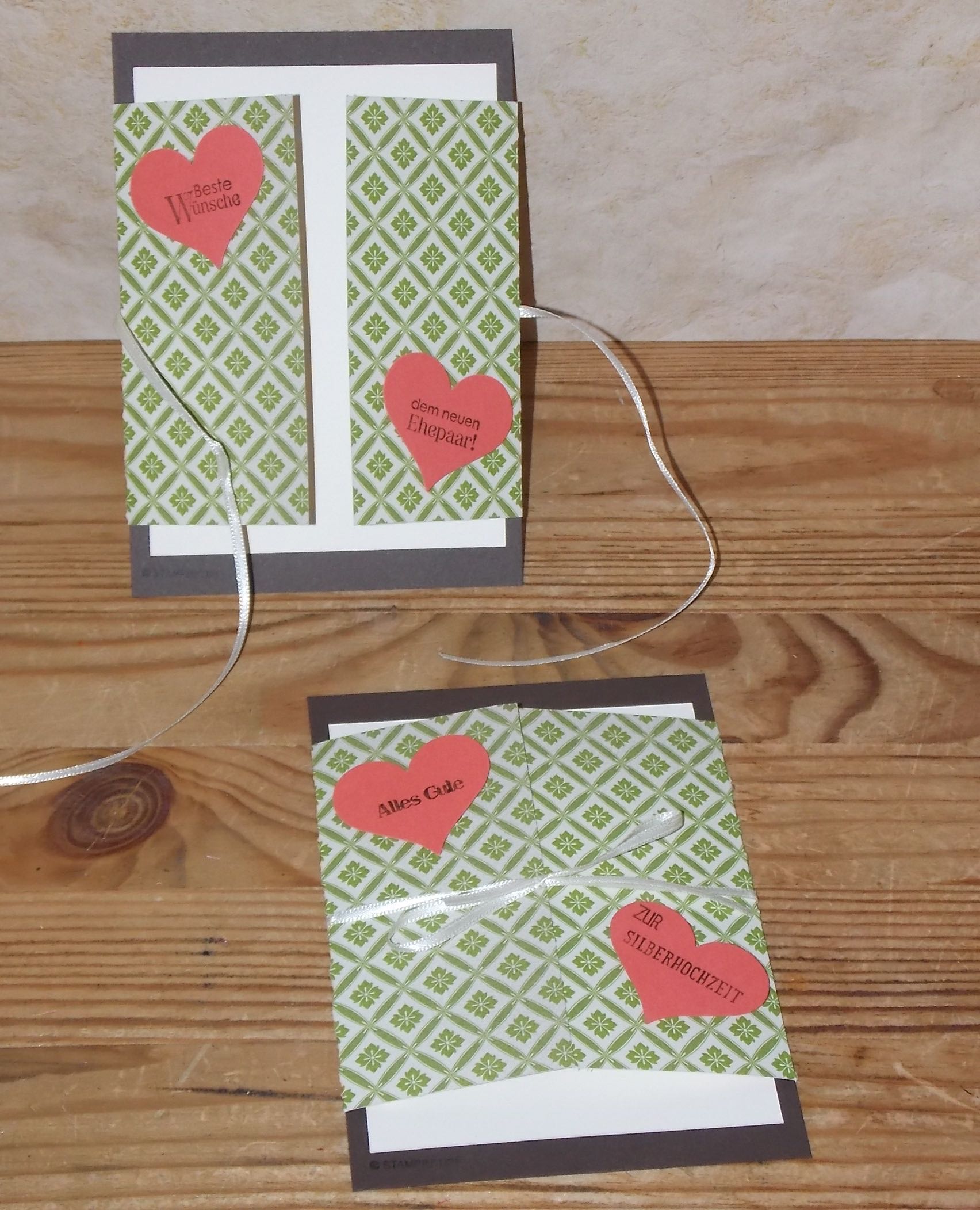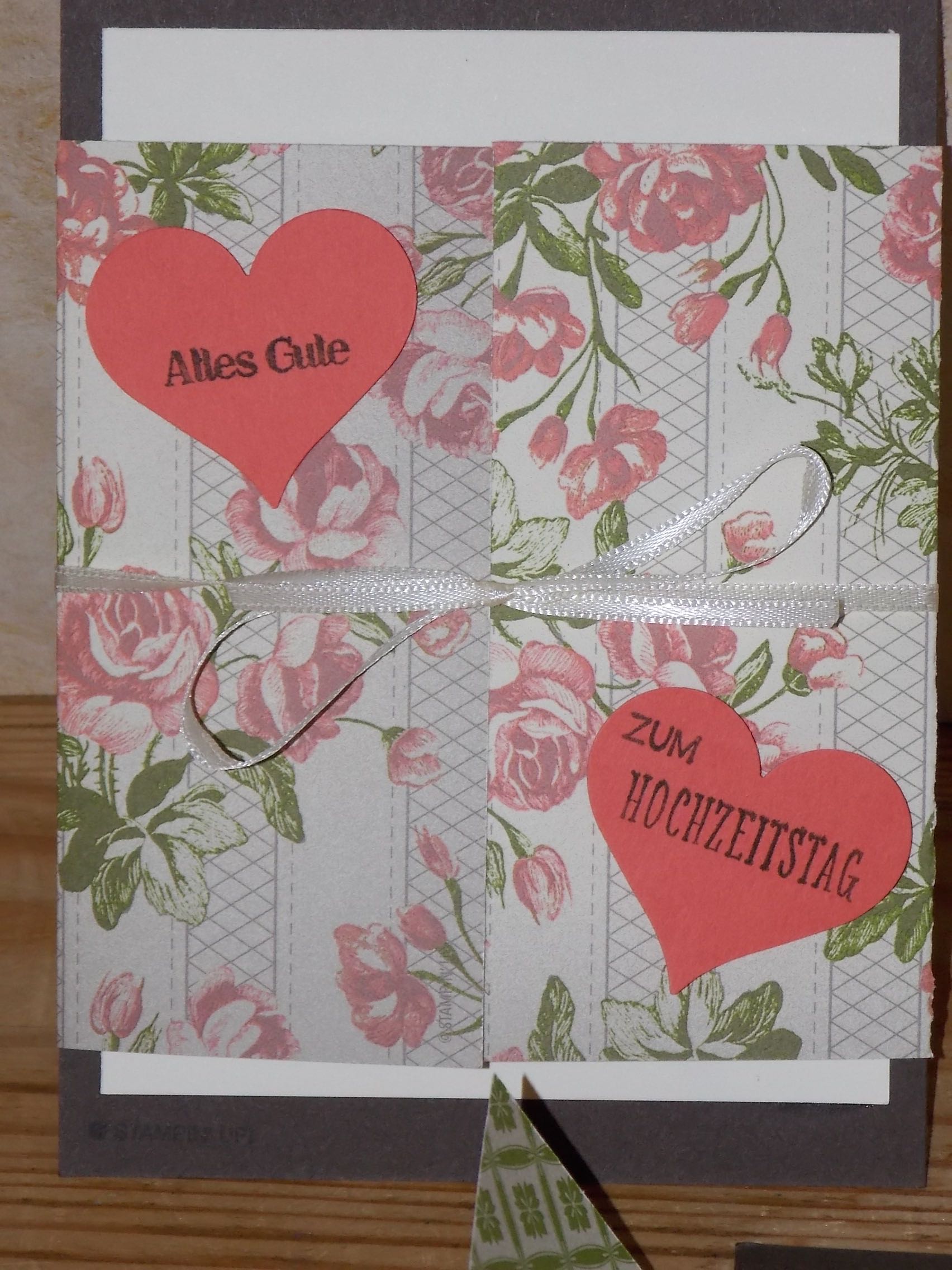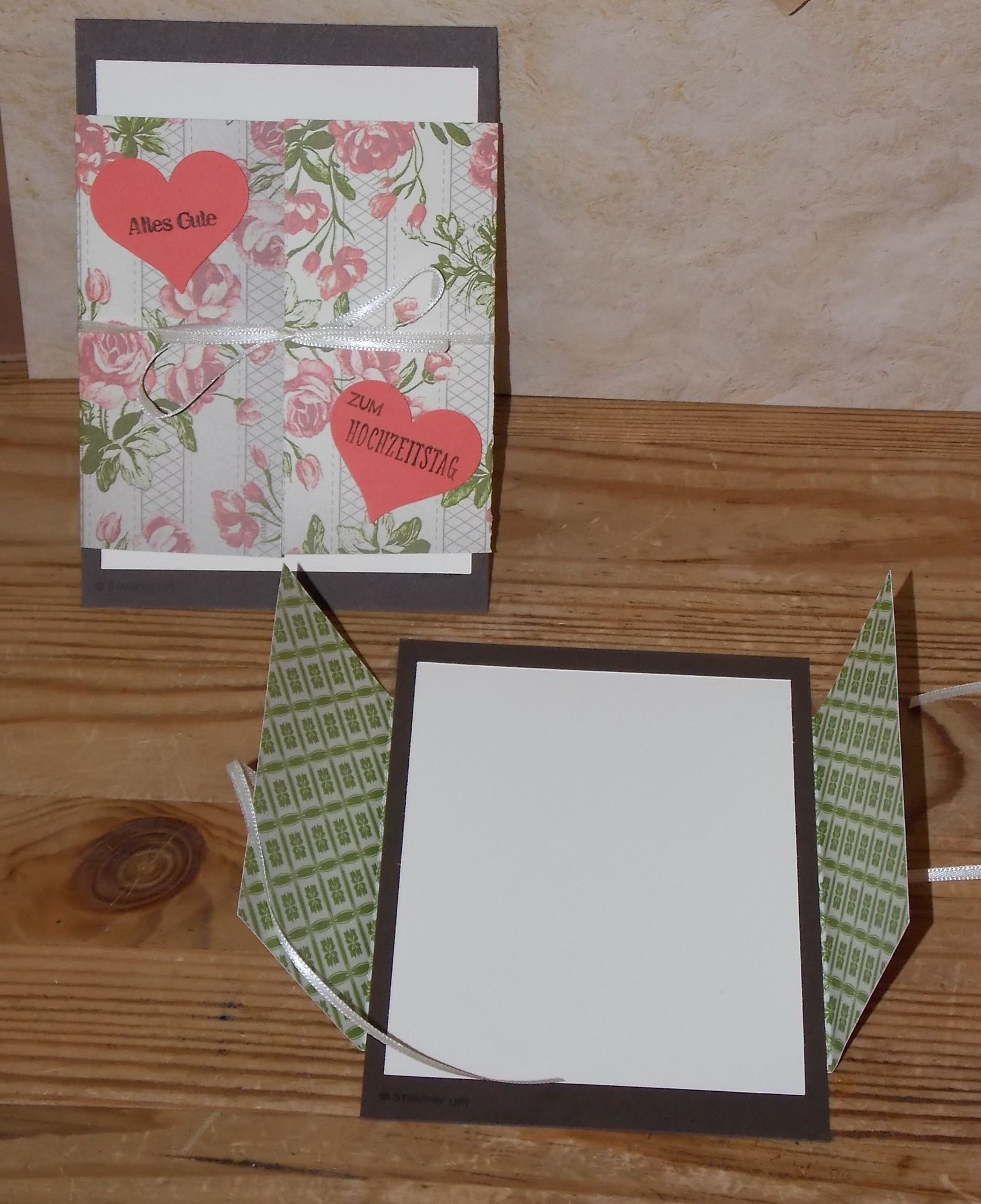 Ich habe eine ganze Kiste voller Streichel-Papiere. Mein Ziel, bis zum nächsten Jahreskatalog den Vorrat mindestens um die Hälfte zu reduzieren. Den Anfang machten am Wochenende 3 Bögen für Hochzeitskarten. Ich musste mal was neues ausprobieren. Raus kam dieses Kartenformat: