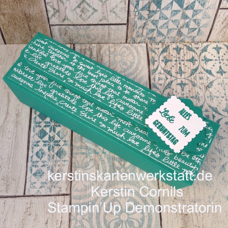Ich leere gerade meinen Papiervorrat. Dabei kamen diese selbstgebastelten Geschenkboxen aus Papier heraus. Die Boxen sind jeweils Ton in Ton gehalten. Das Designpapier mit Text ist mein absoluter Favorit des letzten Stampin‘ Up Katalogs gewesen. Echt schade, dass ich mich jetzt nach und nach von dem Papier verabschieden muss. Aber wenn so schöne kleine Boxen dabei herauskommen ist die Trauer nicht mehr ganz so groß.