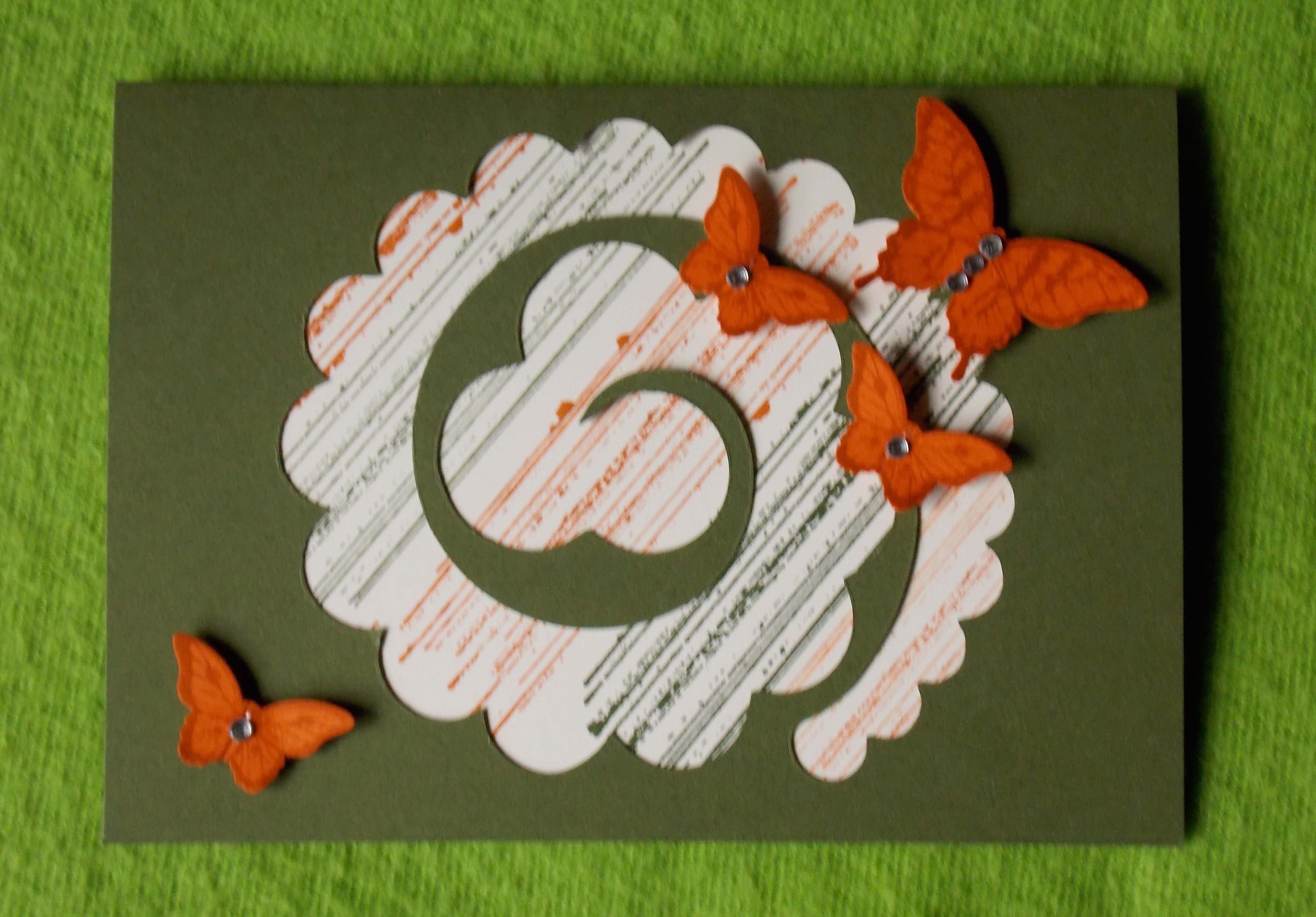 Also entstand dieser Ausschnitt beim Werkeln einer Spiralblume in Waldmoos. Als Hintergrund habe ich Vanille Pur mit Orangentraum und Waldmoos mit einem Stempel aus dem Set „Gorgeous Grunge“ verziert. Um der Karte noch ein paar Akzente zu setzen flattern vier Schmetterlinge in Orangentraum Ton in Ton gestempelt über die Spirale.