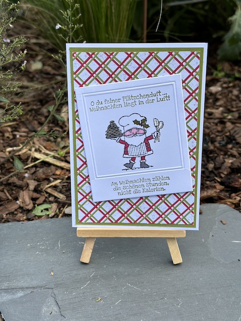 Übrigens findet sich in dem Stempelset auch noch ein backender Weihnachtsmann, der direkt mit gestempelt werden wollte. Er wollte aber partout nicht auf einen Kreis und so habe ich ihn auf einen weißen Grund gestempelt, den ich dann mit dem Prägefolder Polaroid bearbeitet habe.